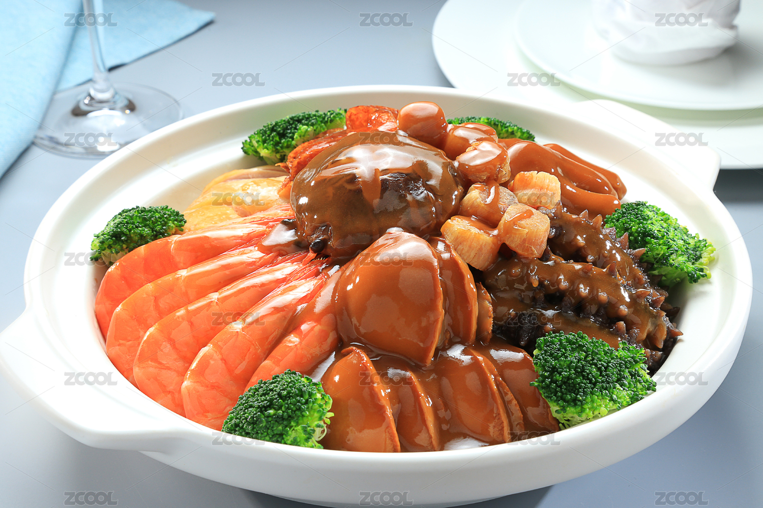 精美餐具装的浇汁鲜鲍鱼烧梅花参