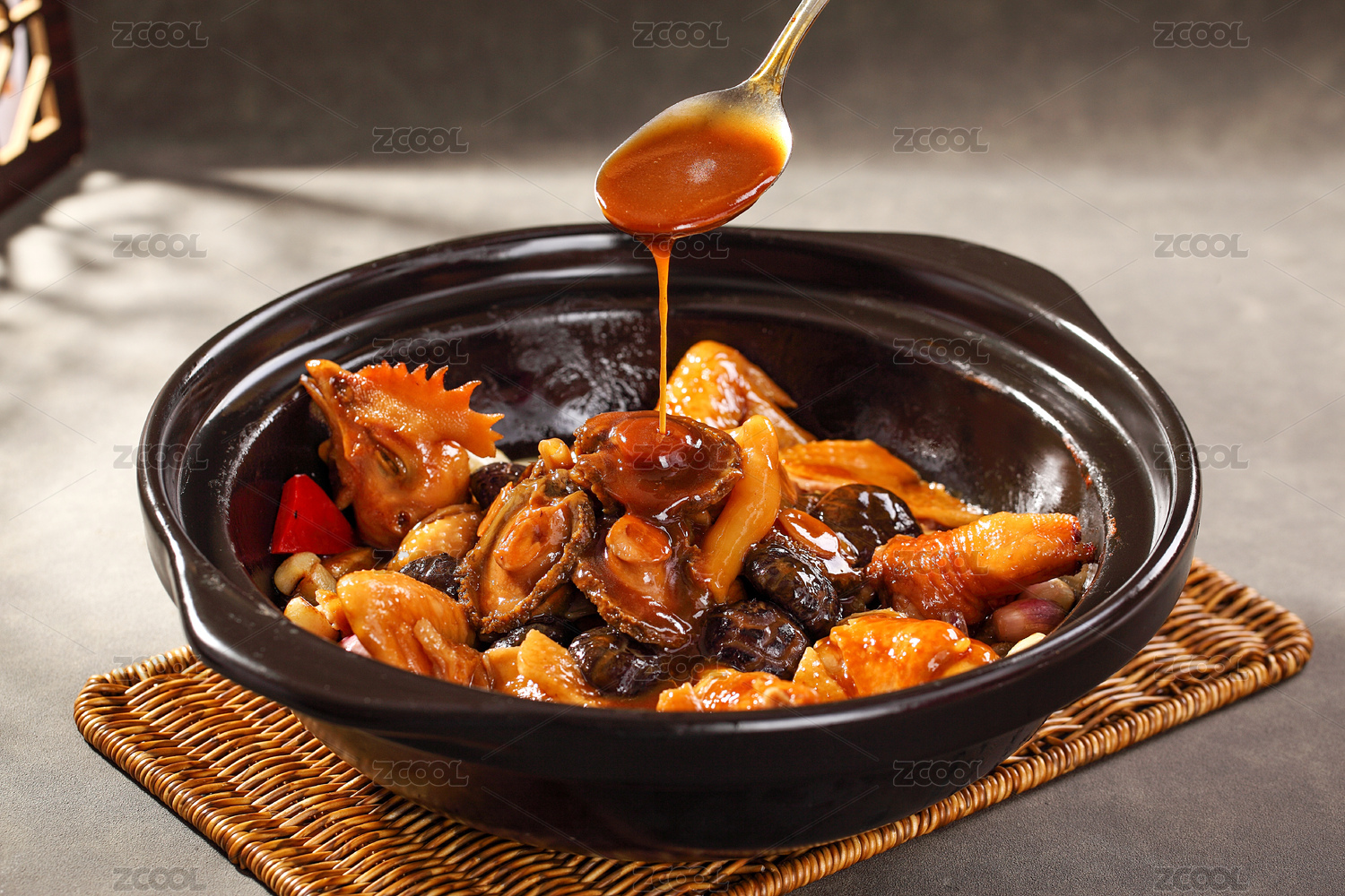 砂锅鲜鲍鱼皮参焖蹄筋配西蓝花