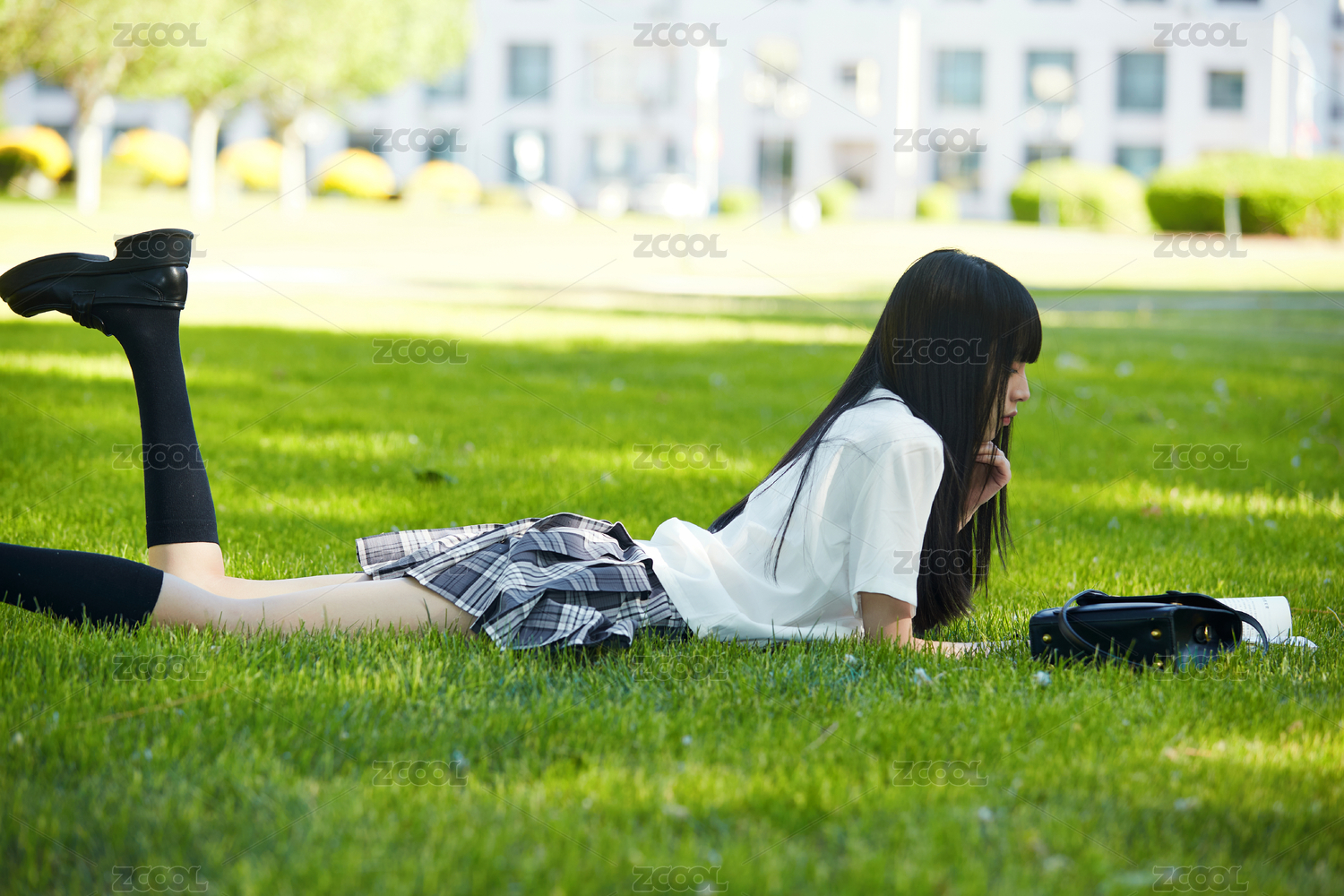 在户外草坪看书学习的女生