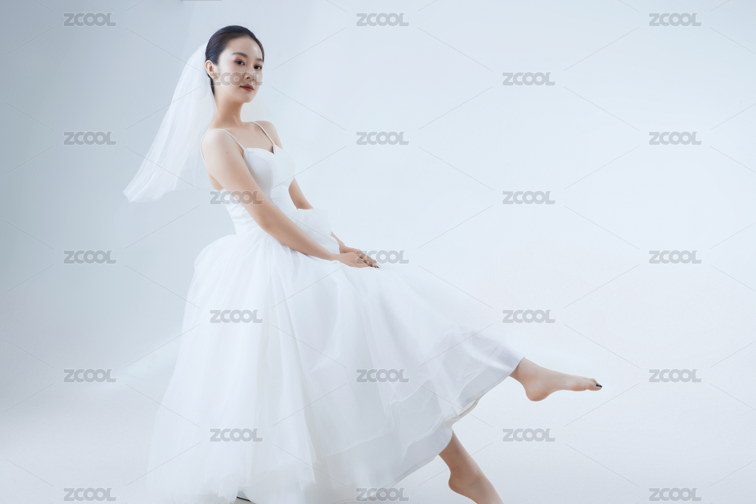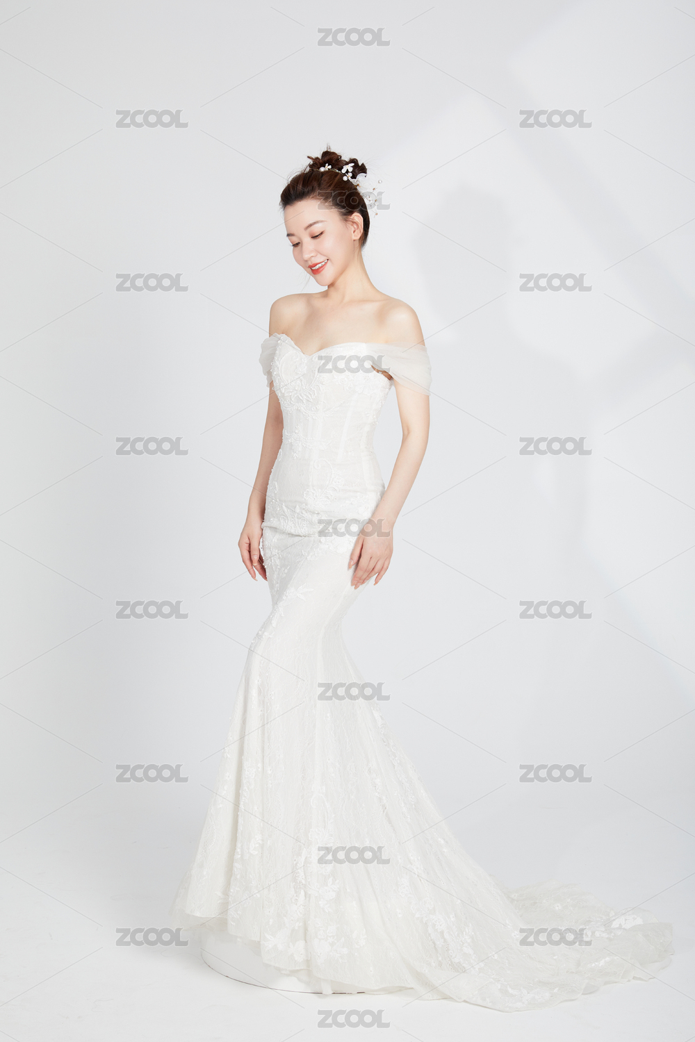 优雅的新娘穿着白色的鱼尾婚纱礼服低头微笑