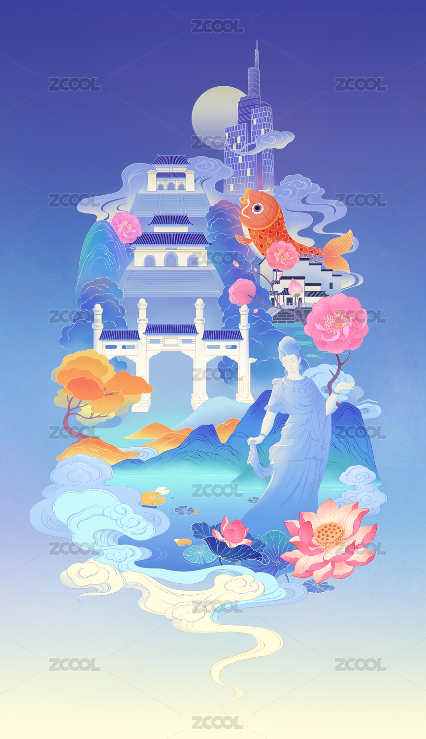 国风插画南京地标中山陵玄武湖夫子庙