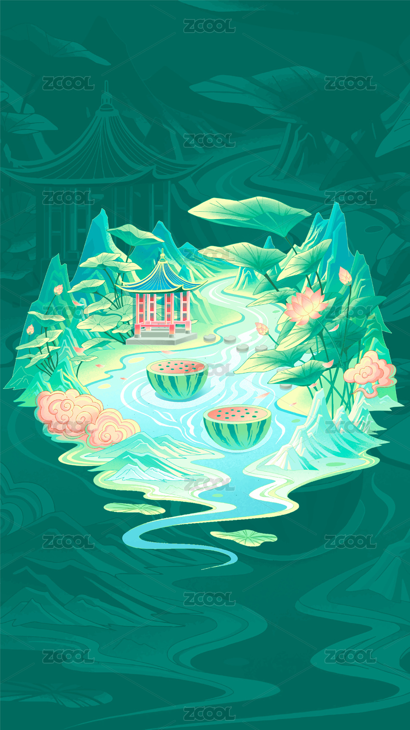 国潮风夏季节气时漂浮水中的西瓜及荷叶荷花