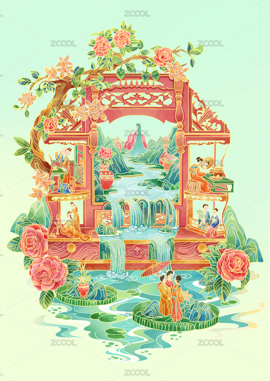 HEYYTGF2020,插画,绘画,国潮,非遗,油纸伞,侍女,中国风,宴饮,山石