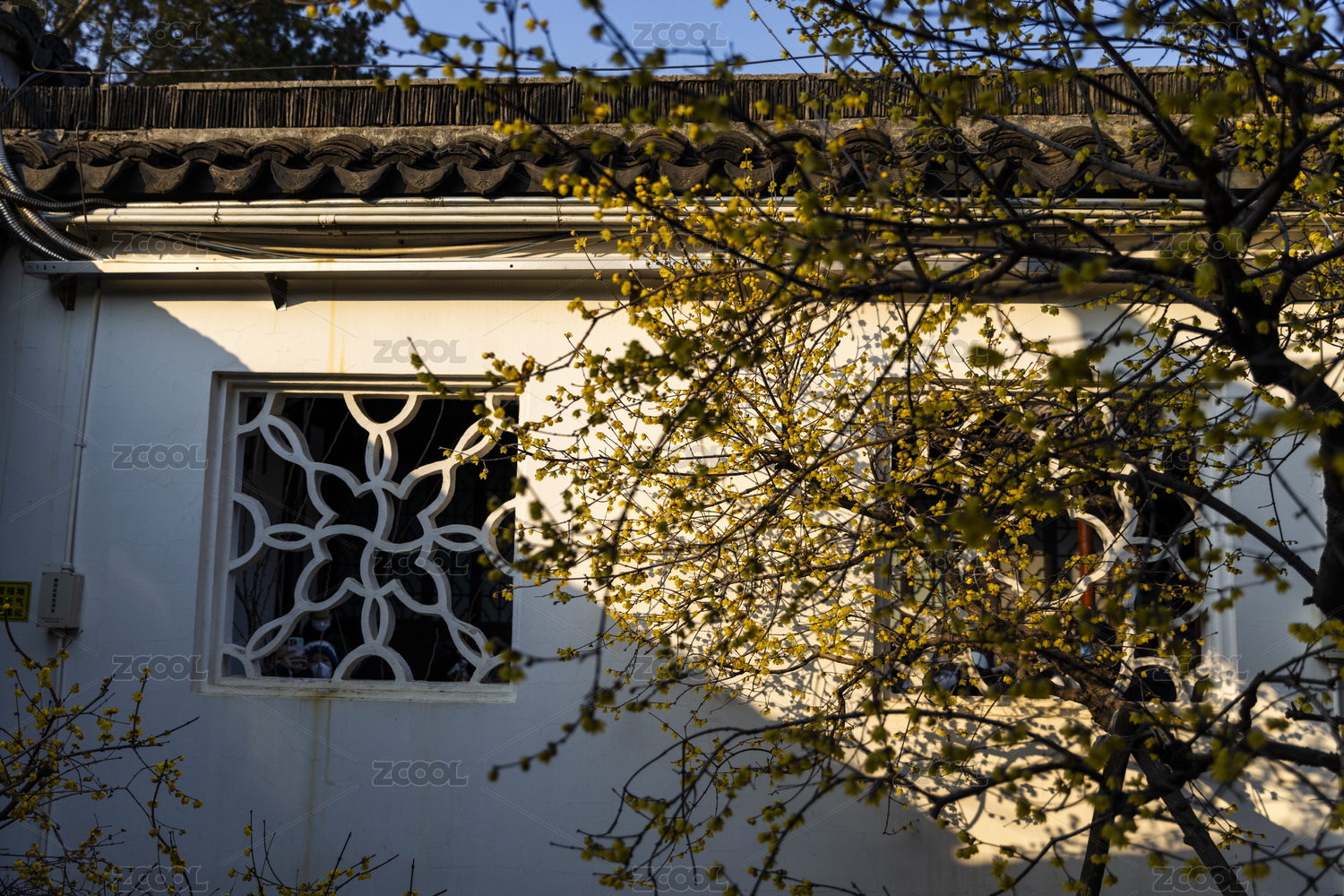 黑色屋檐白墙上四方形中式古建筑镂空花窗