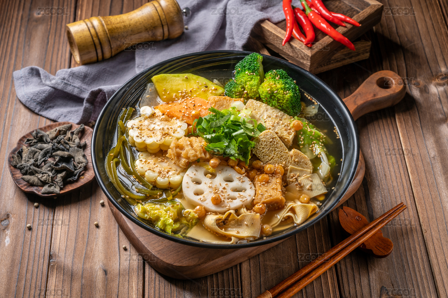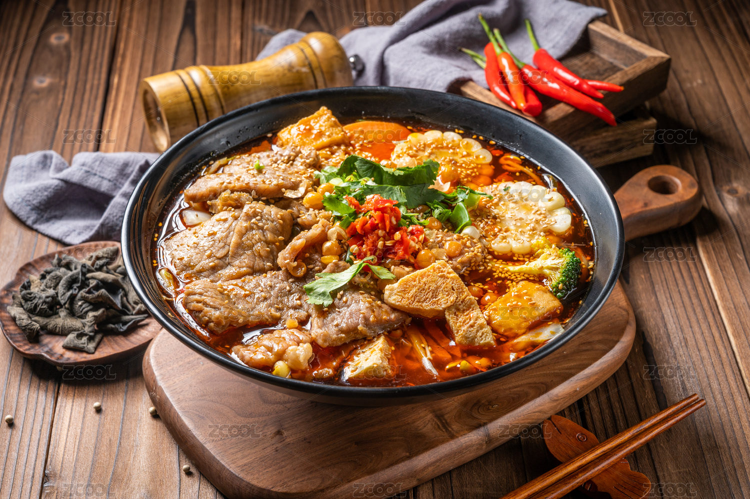 冒菜,丸子,藕片,冻豆腐,鱼豆腐,玉米,西蓝花,小米辣,麻辣,美食