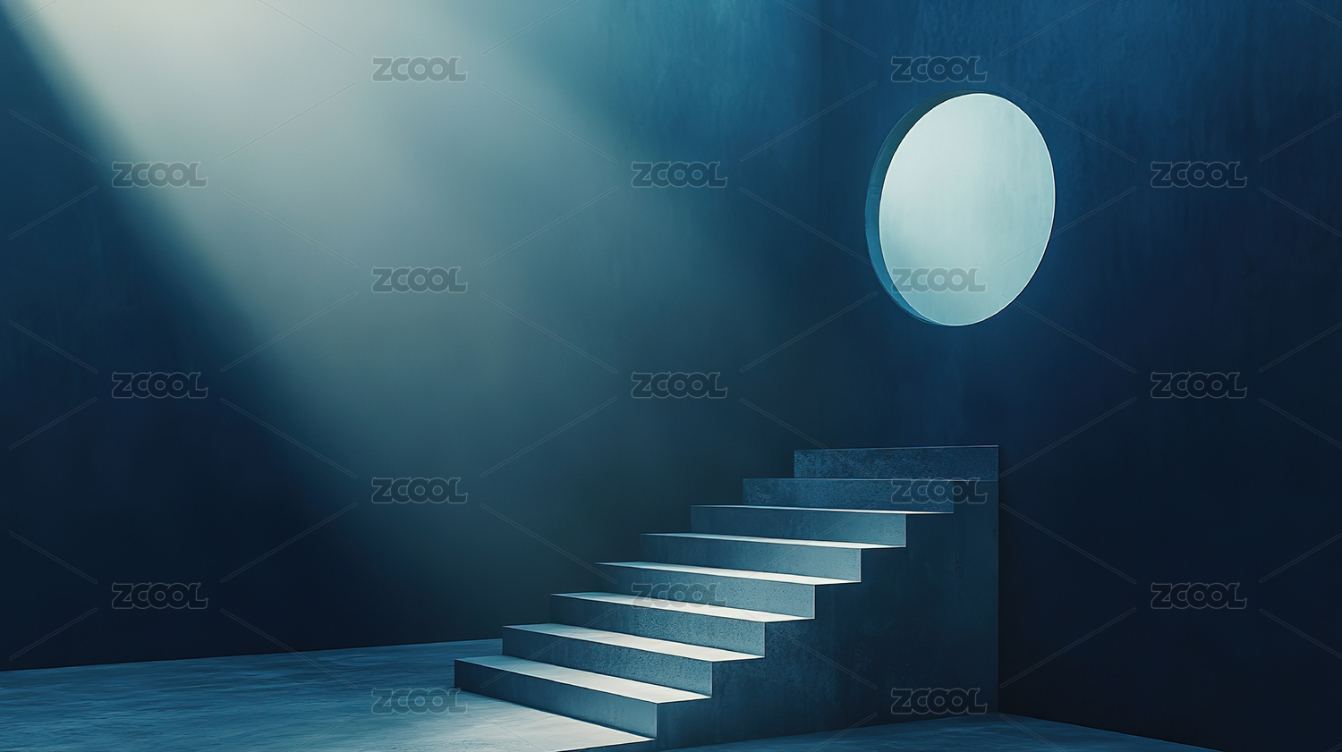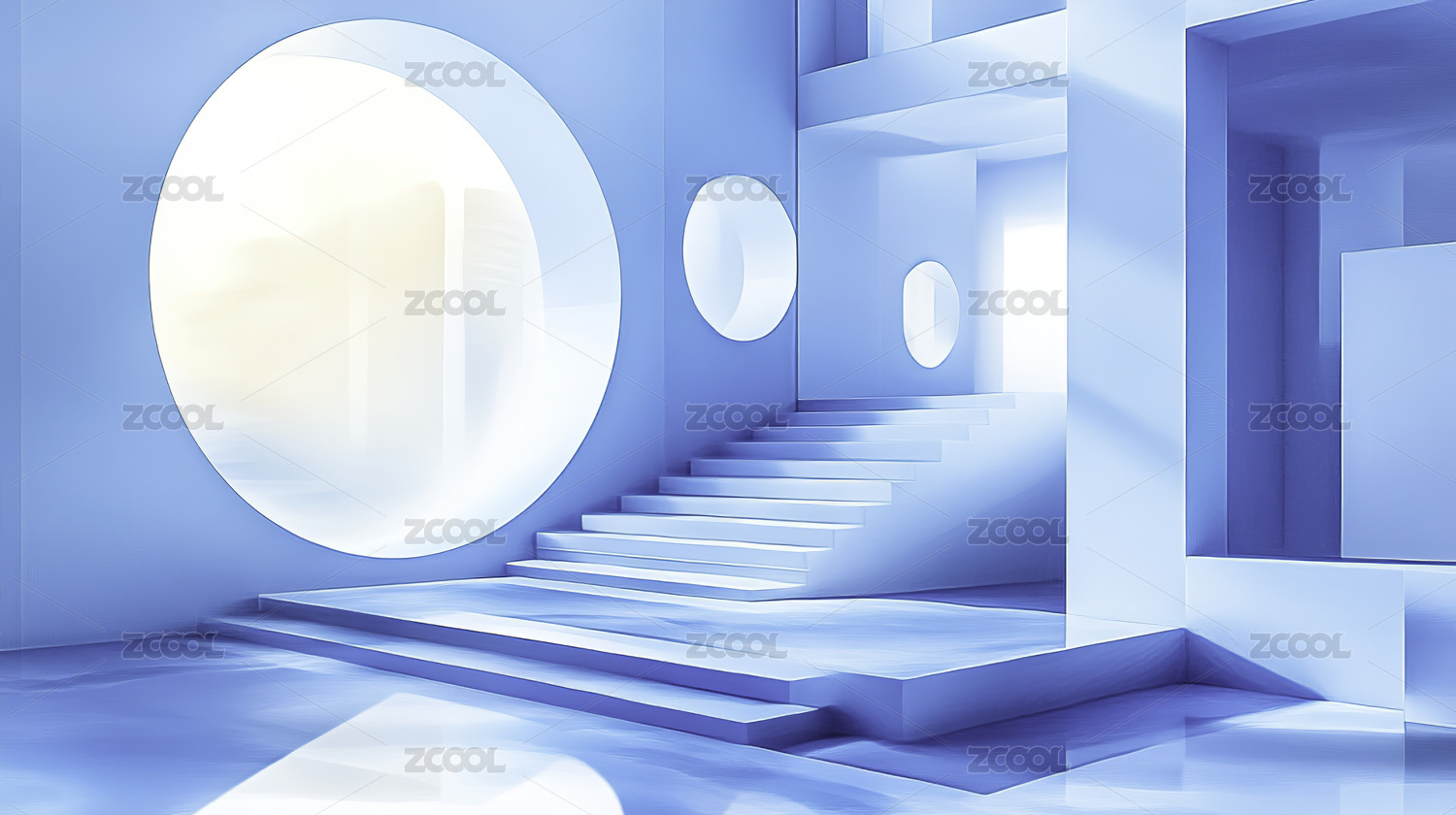 蓝白渐变,圆形窗户、浅色墙壁和前景楼梯
