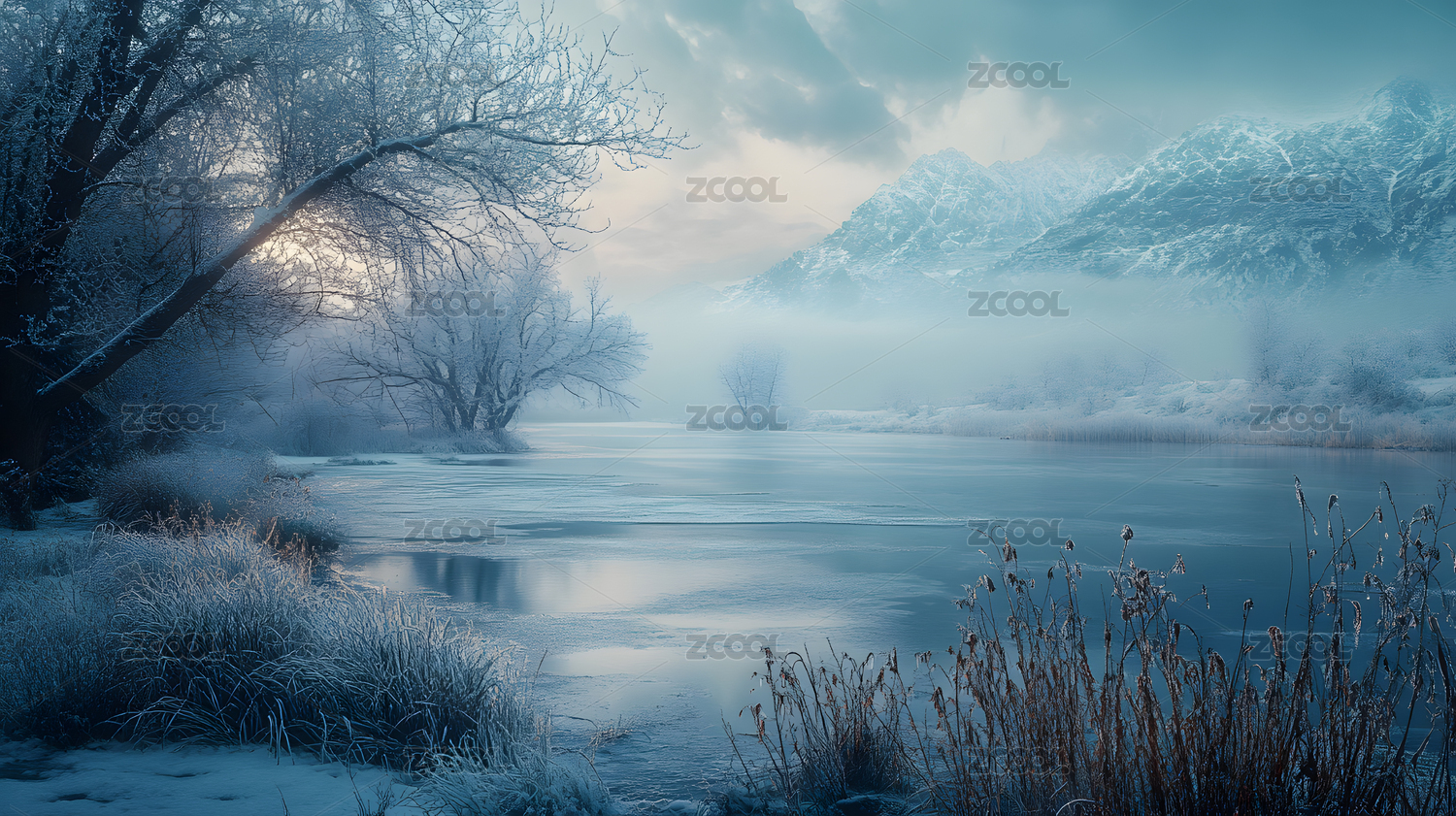 冰雪覆盖的宁静湖面山景