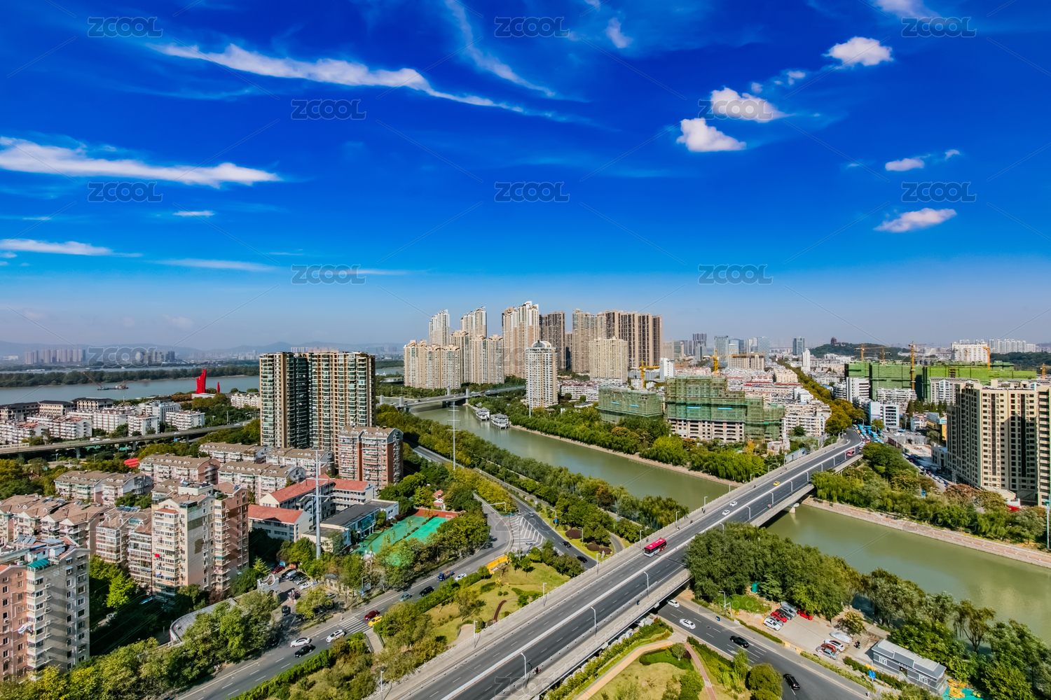 俯瞰中国江阴市现代城市建筑天际线和京杭大
