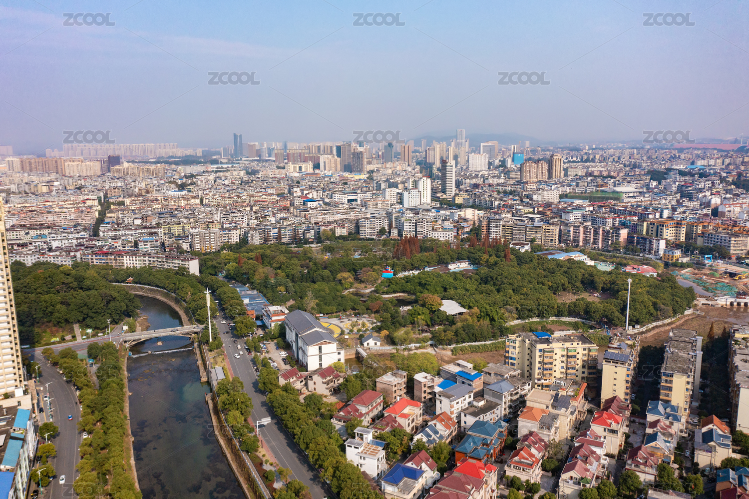 航拍城市风光天际线 江门城区 东湖广场