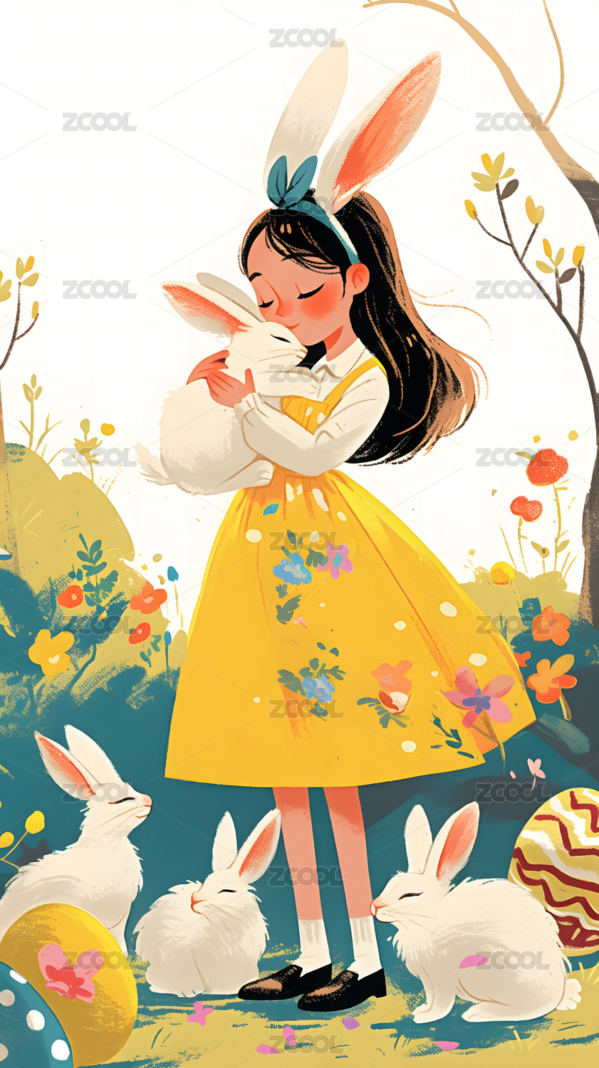 秋天夜晚中秋节可爱女孩与兔子卡通儿童插画