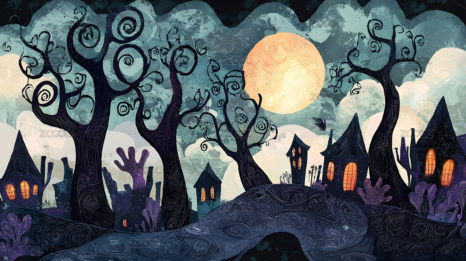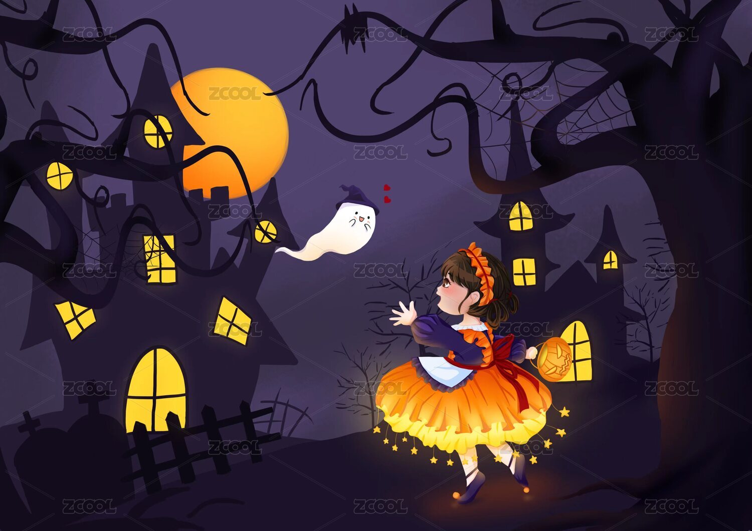 万圣节户外夜晚树下南瓜蝙蝠国风插画