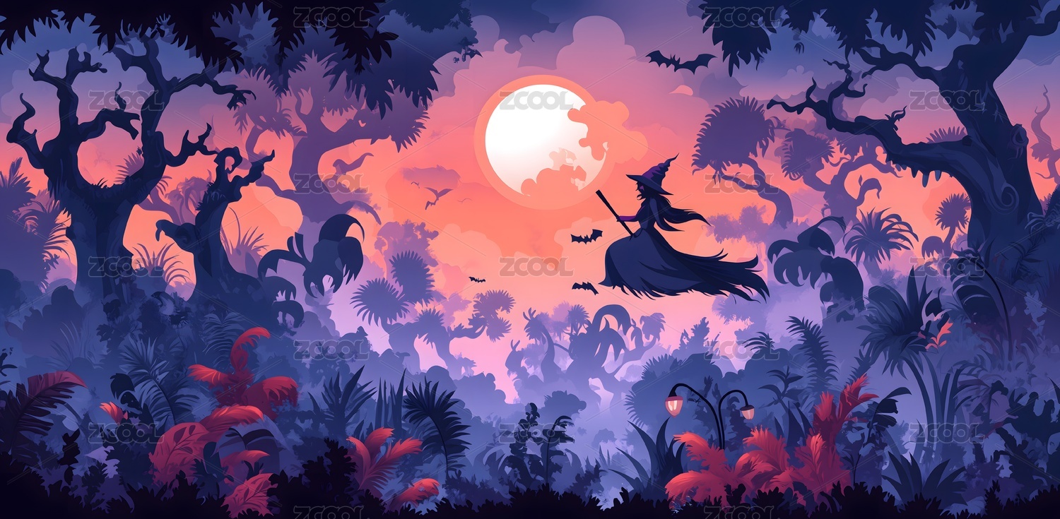 万圣节小女巫骑着草扫帚飞行西方传统节日