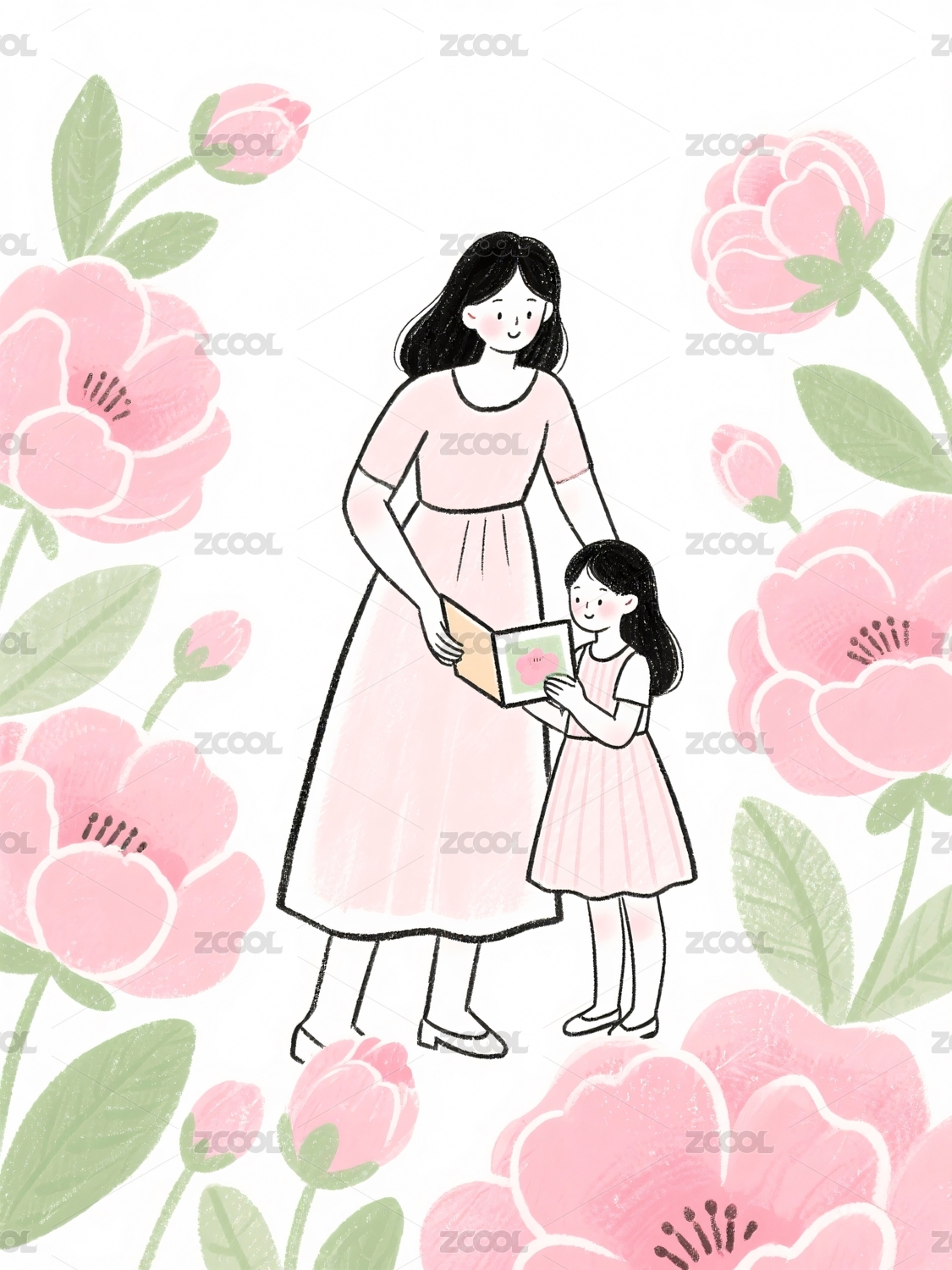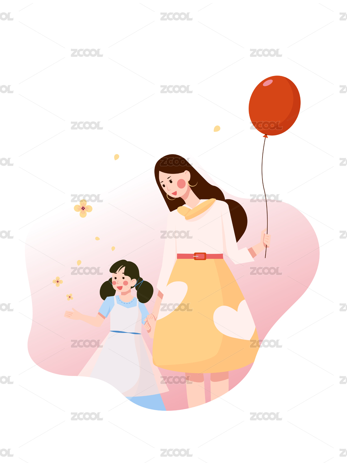粉色可爱母亲节节日插画,孩子感恩母亲献花