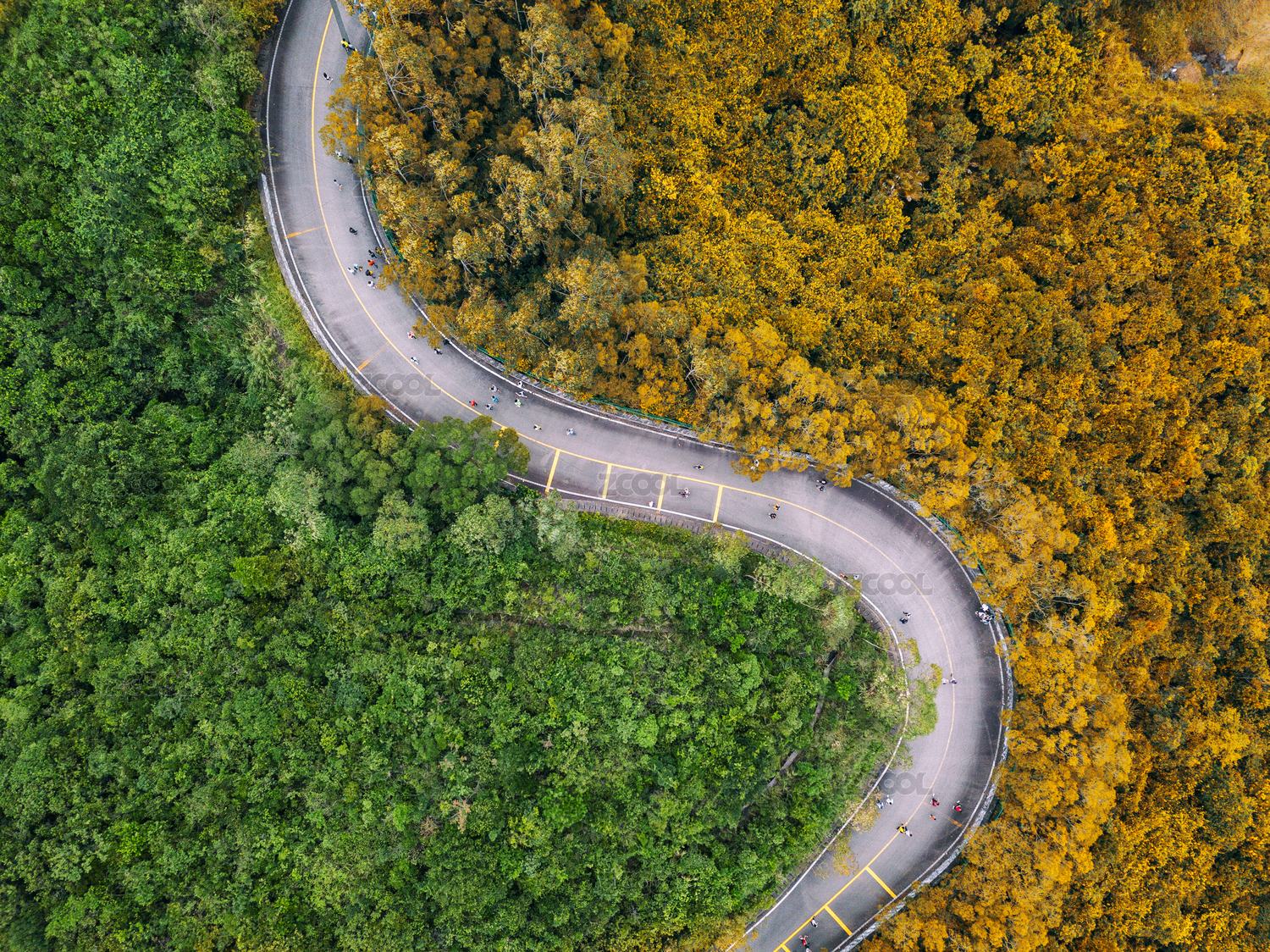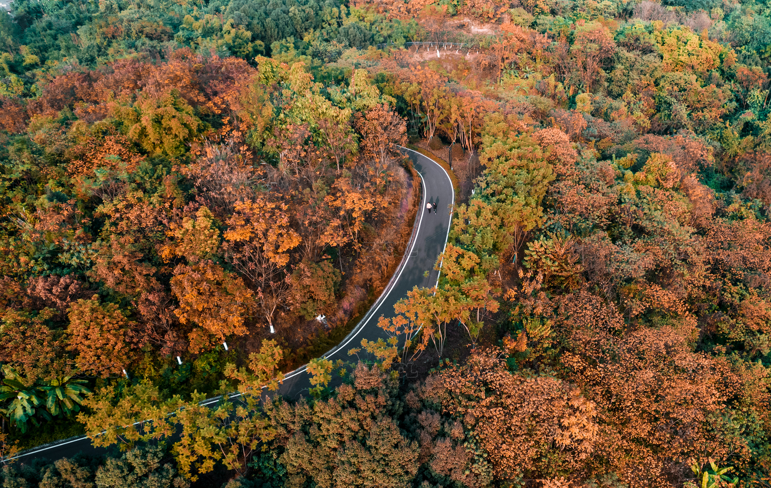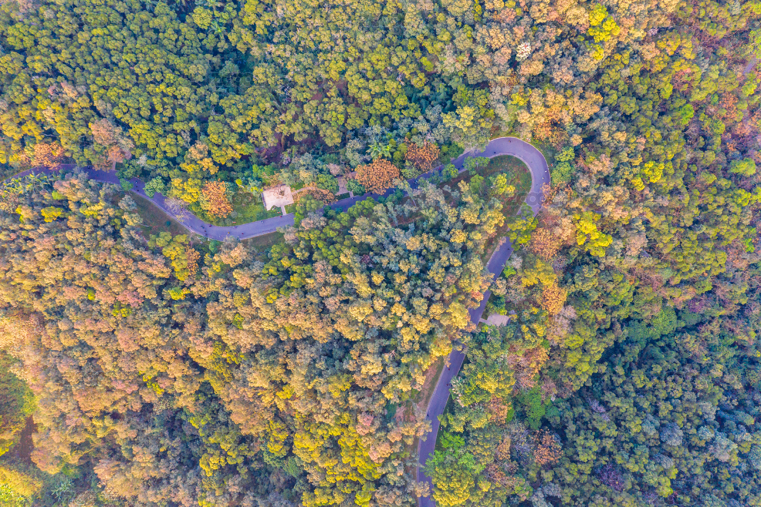 俯视江苏南京穿过五彩斑斓森林蜿蜒的公路