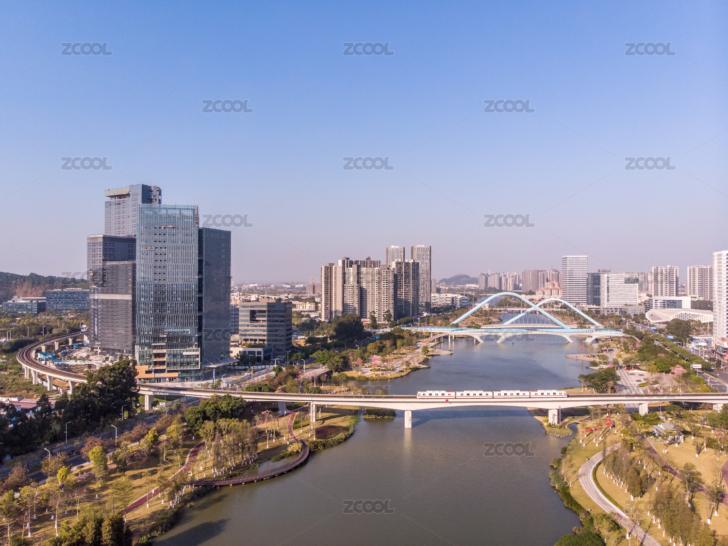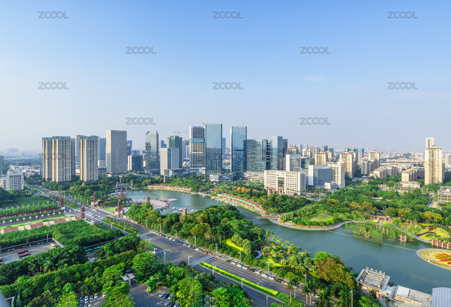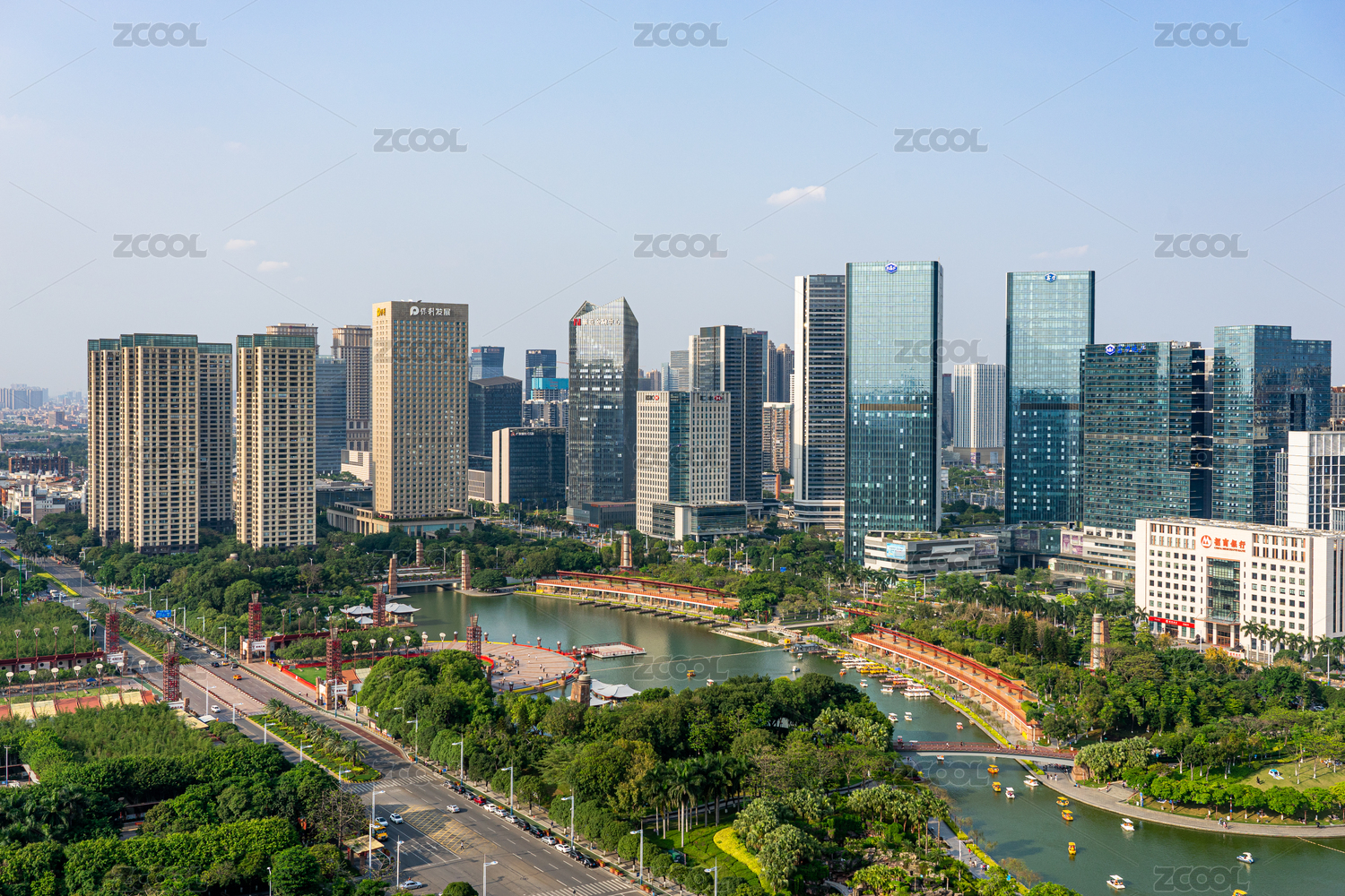 中国广东佛山南海千灯湖公园和金融高新区城市天际线