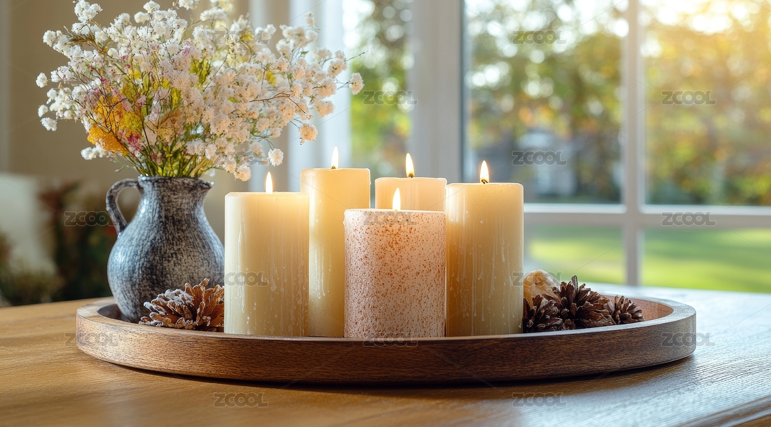 咖啡桌上配有台灯、盆栽和玻璃圆顶蜡烛台