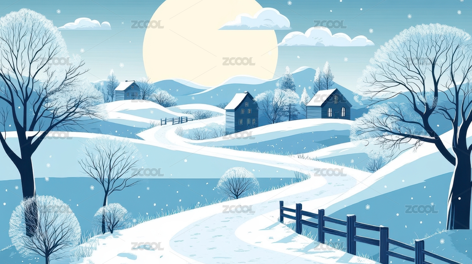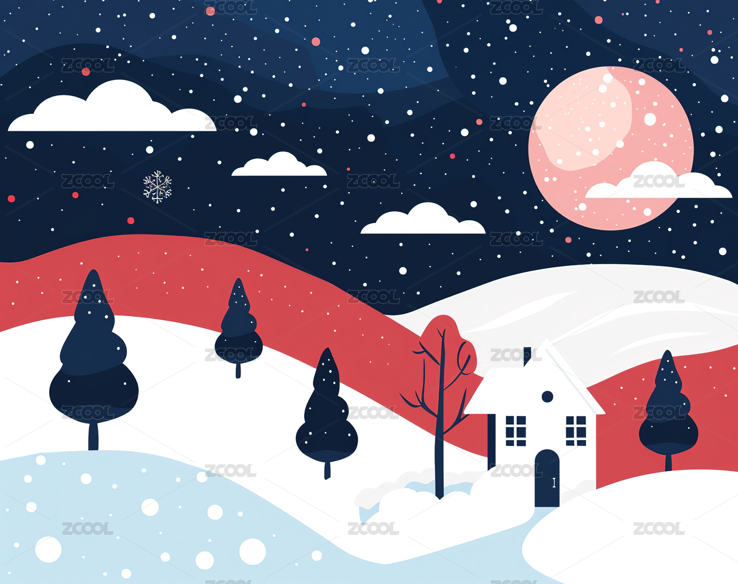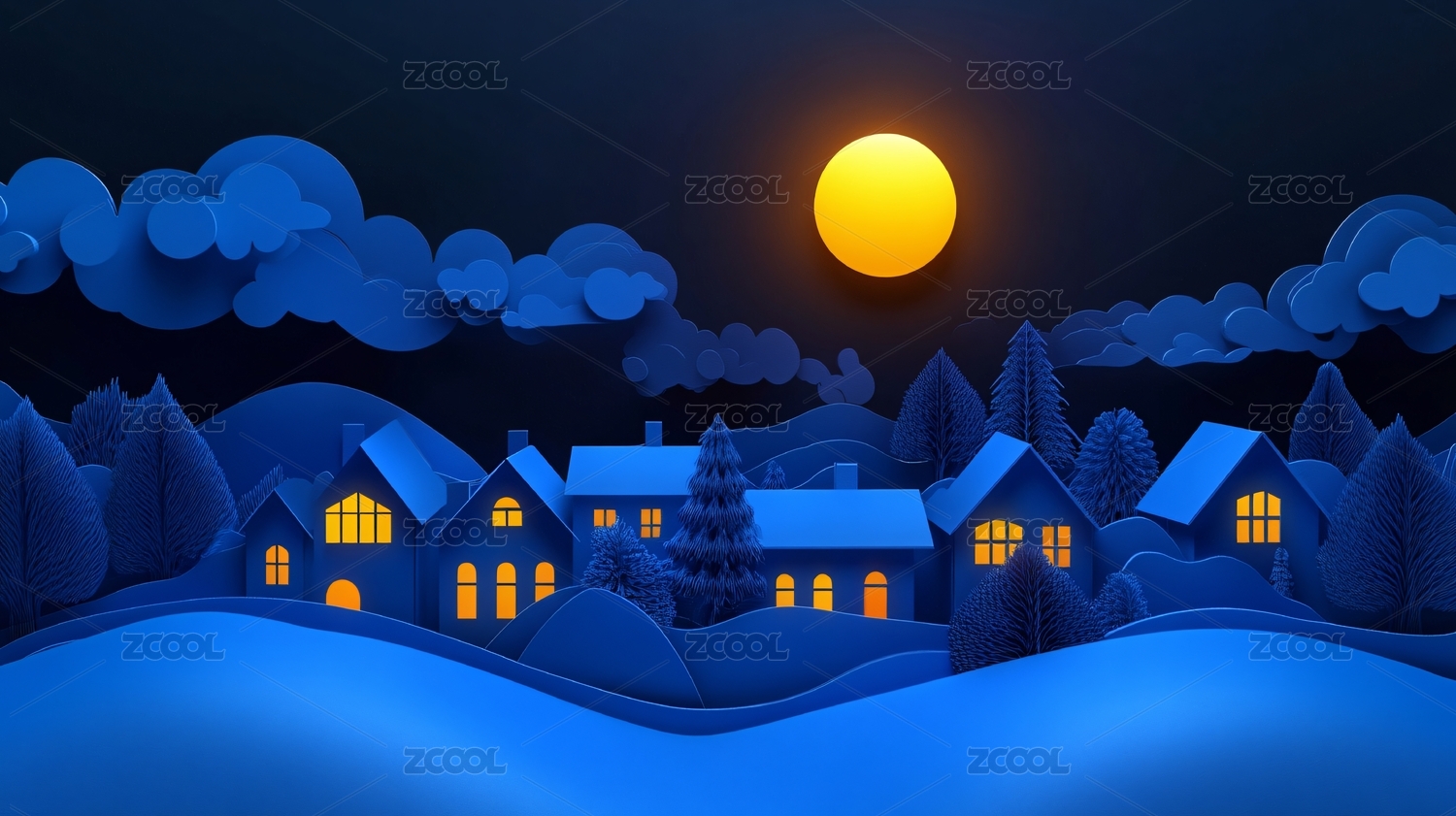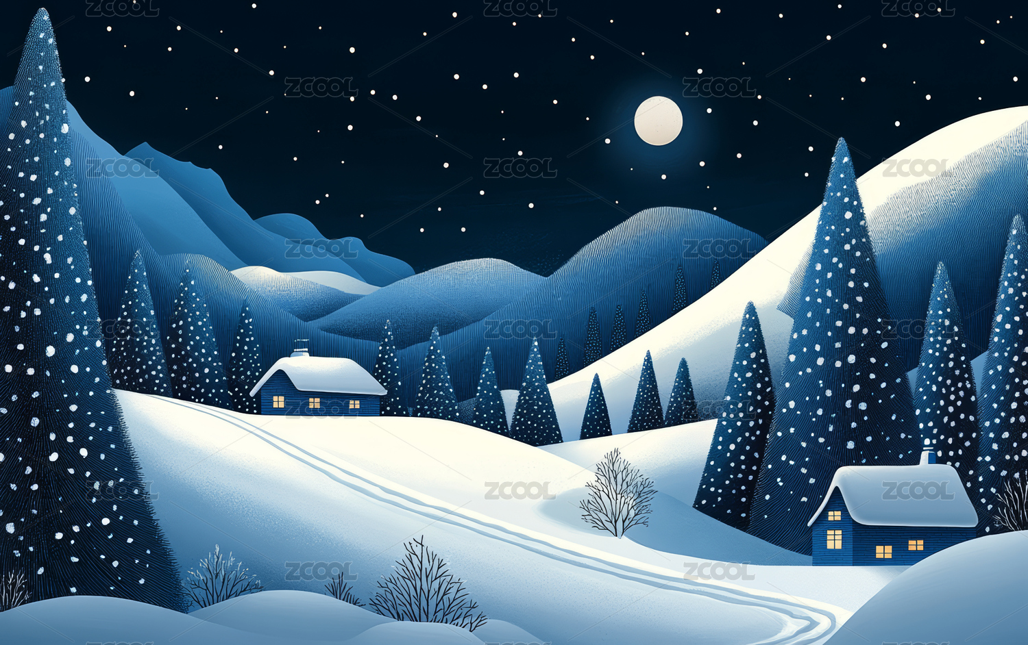 冬夜,雪景,房屋,树木,月亮,飞鸟,山脉,灯光,夜晚,冬季