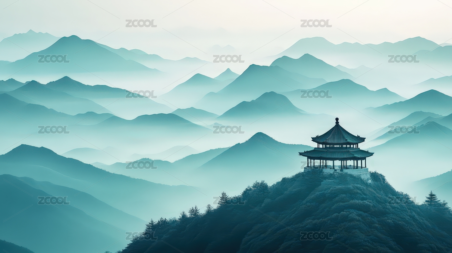 蓝色群山背景中山顶上的亭子中国风风景