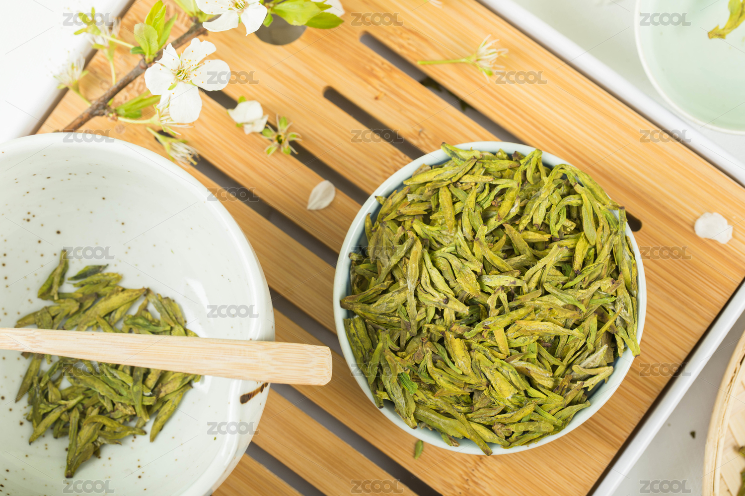 放在桌角的竹篾装有中国茗茶龙井干茶叶