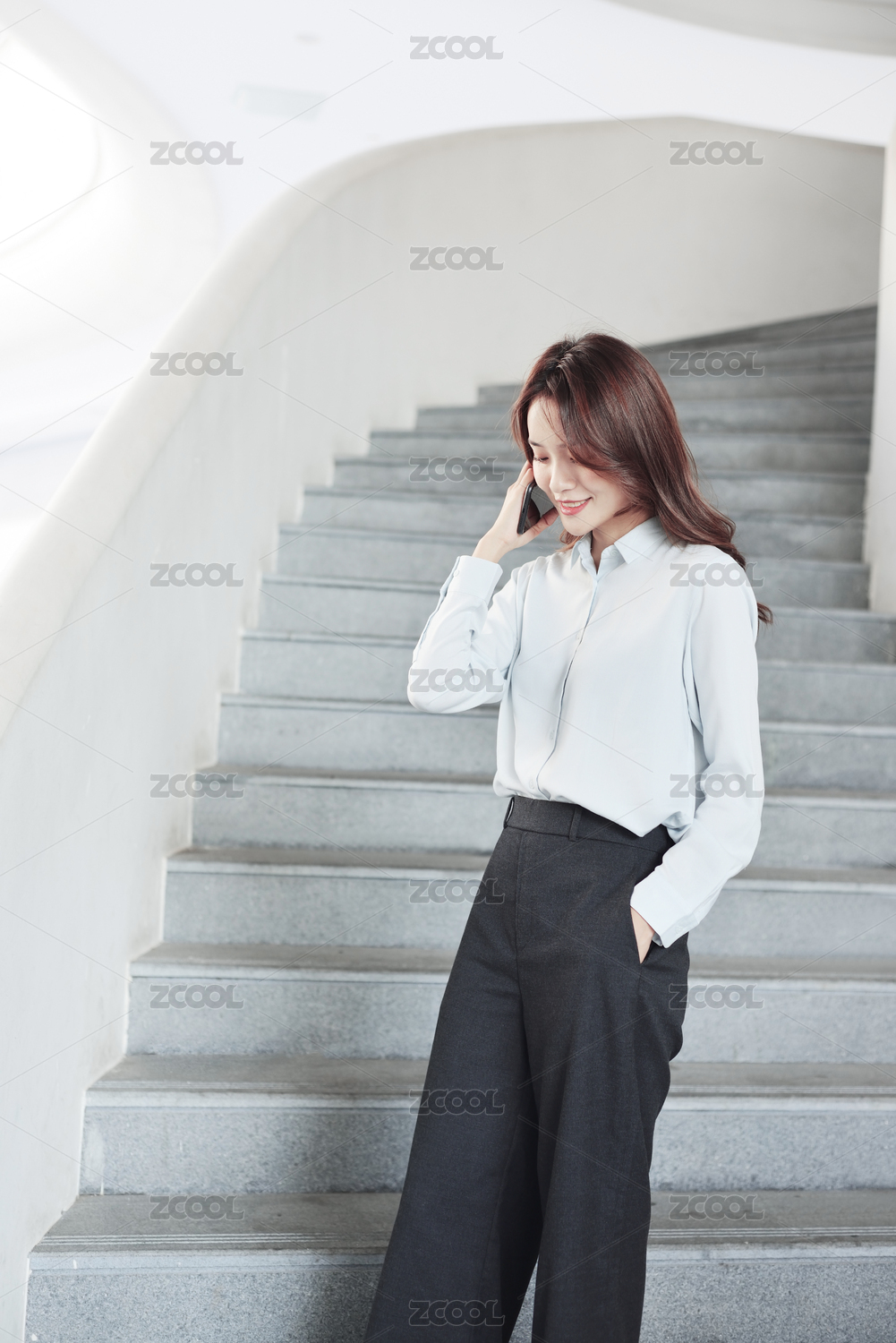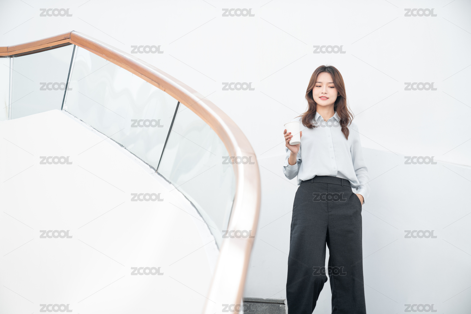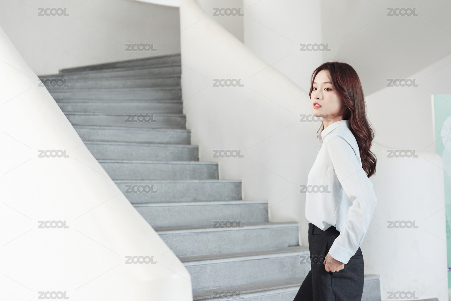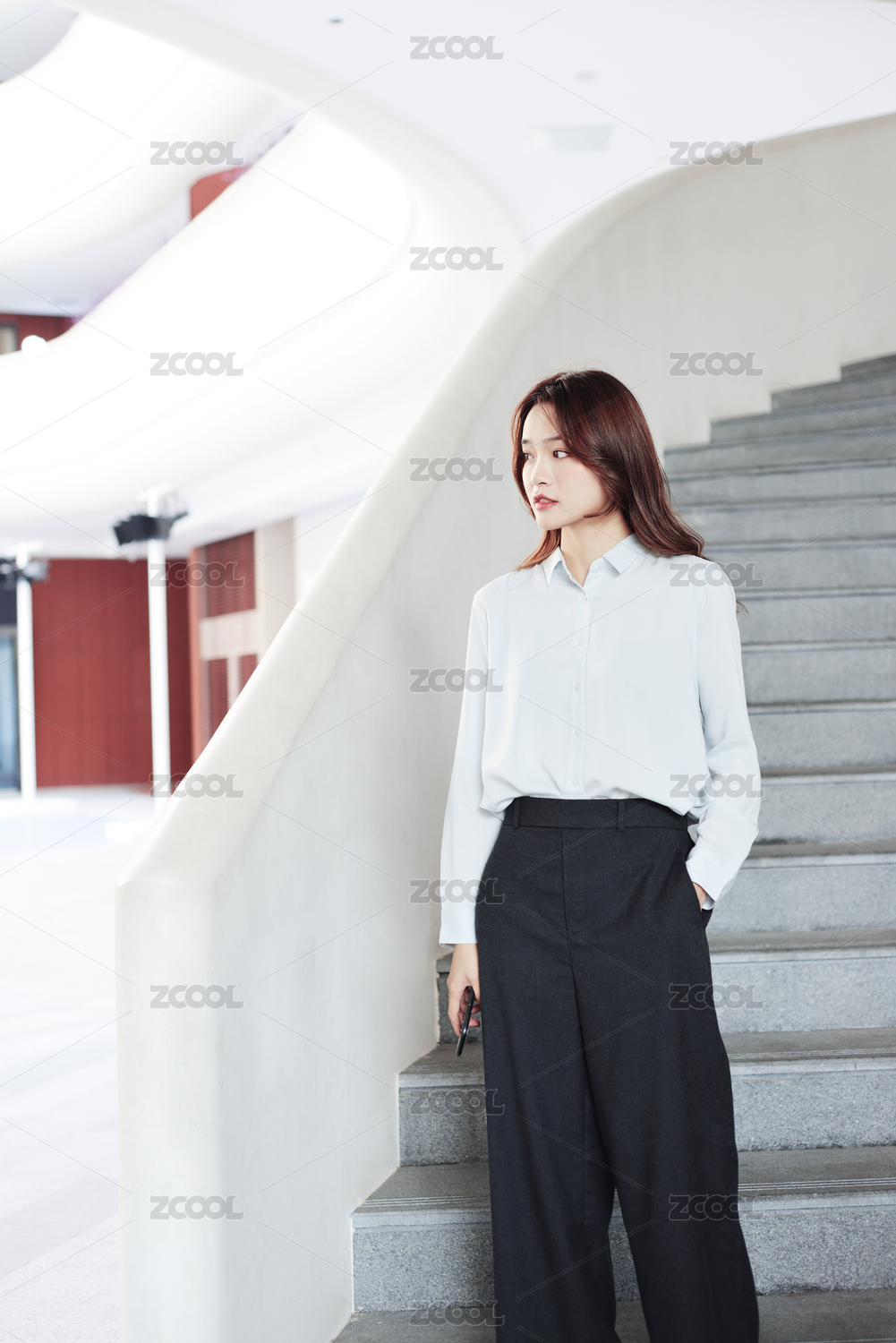 站在楼梯上的一名中国年轻女职员