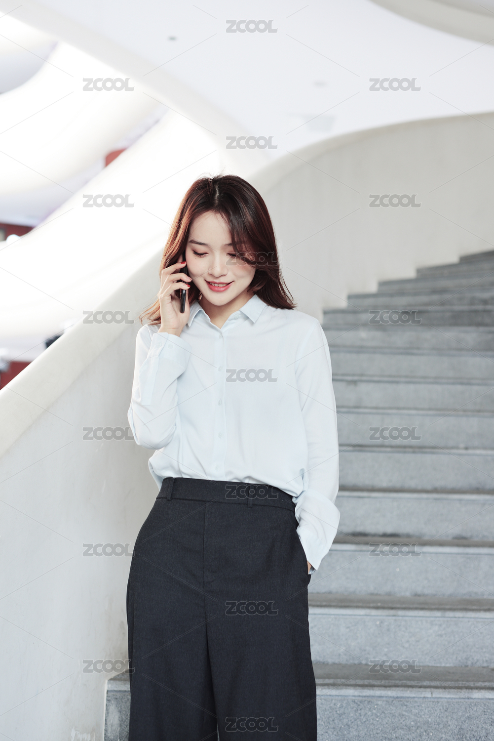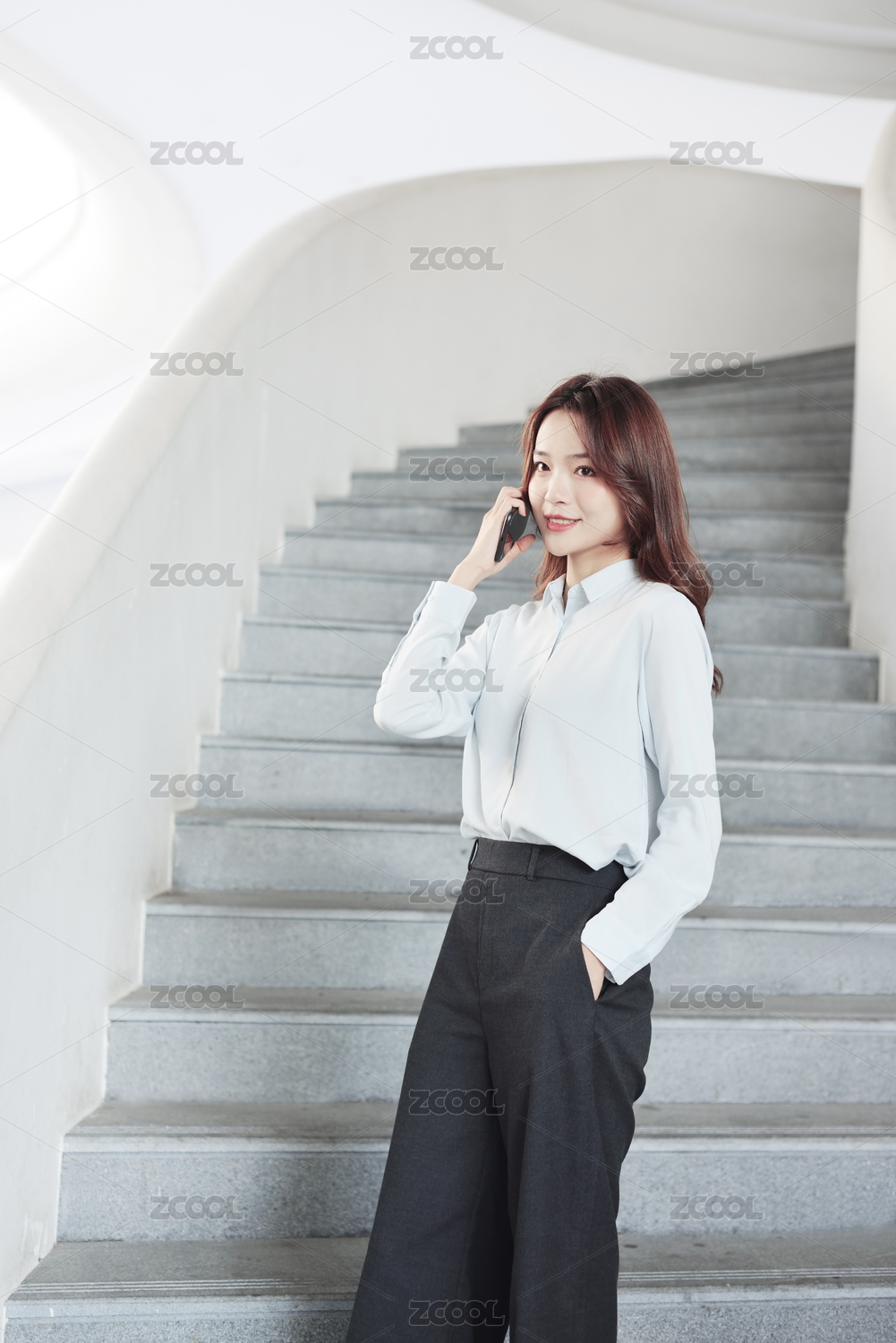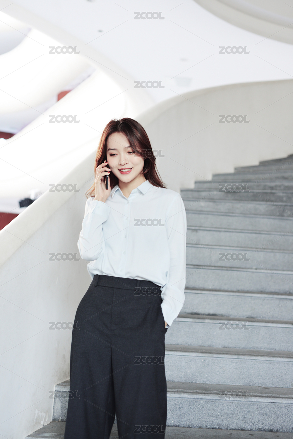 站在楼梯上的一名中国年轻女职员
