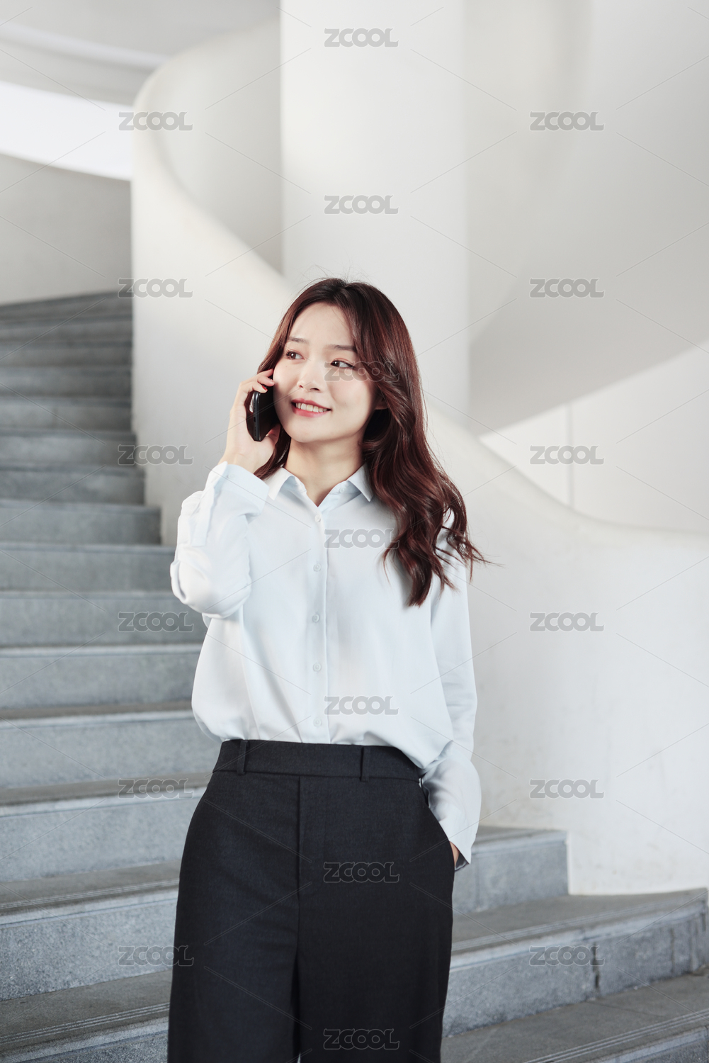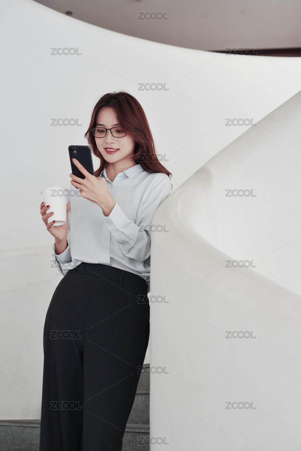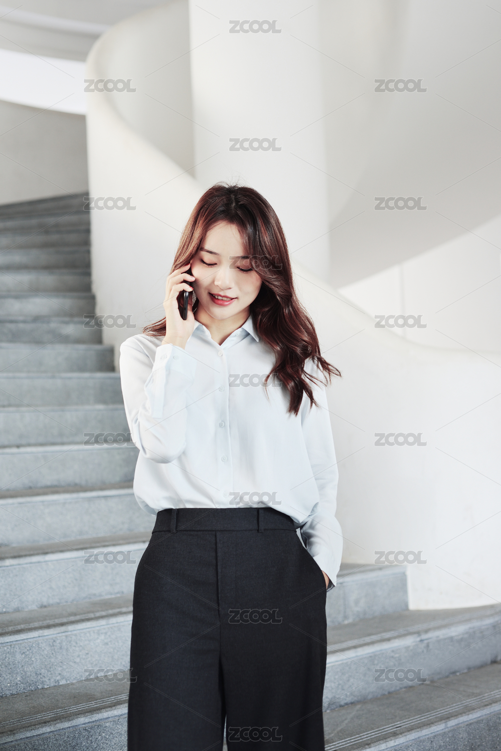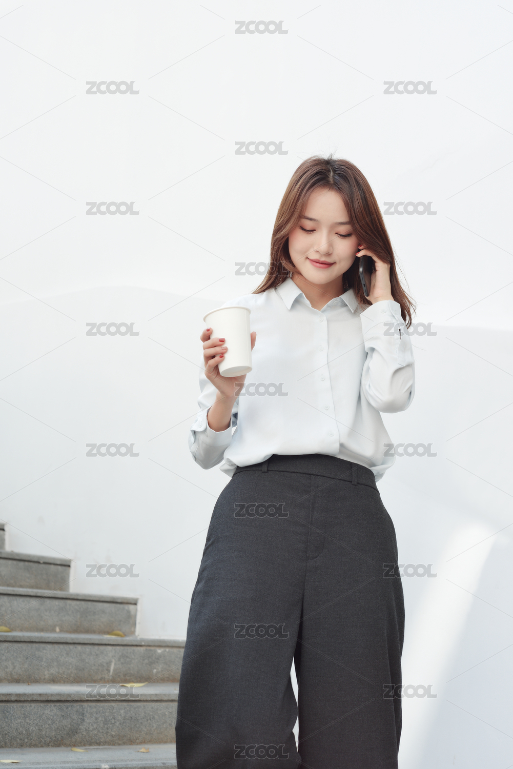 站在楼梯上的一名中国年轻女职员