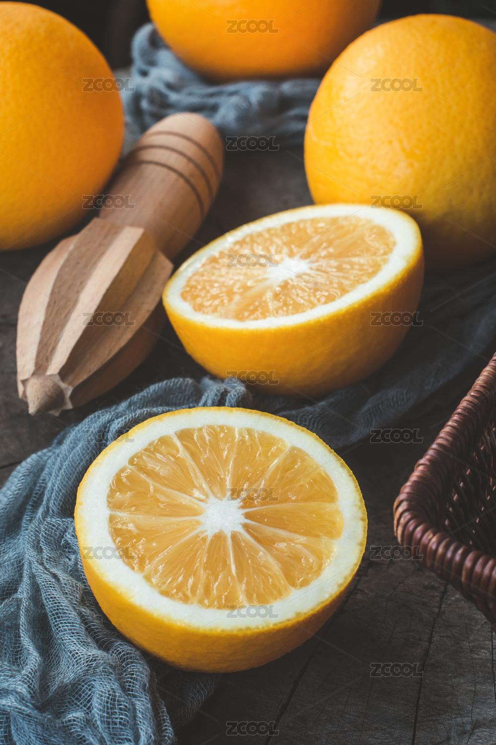 两个完整的和切成一半的脐橙一起放着竹垫上