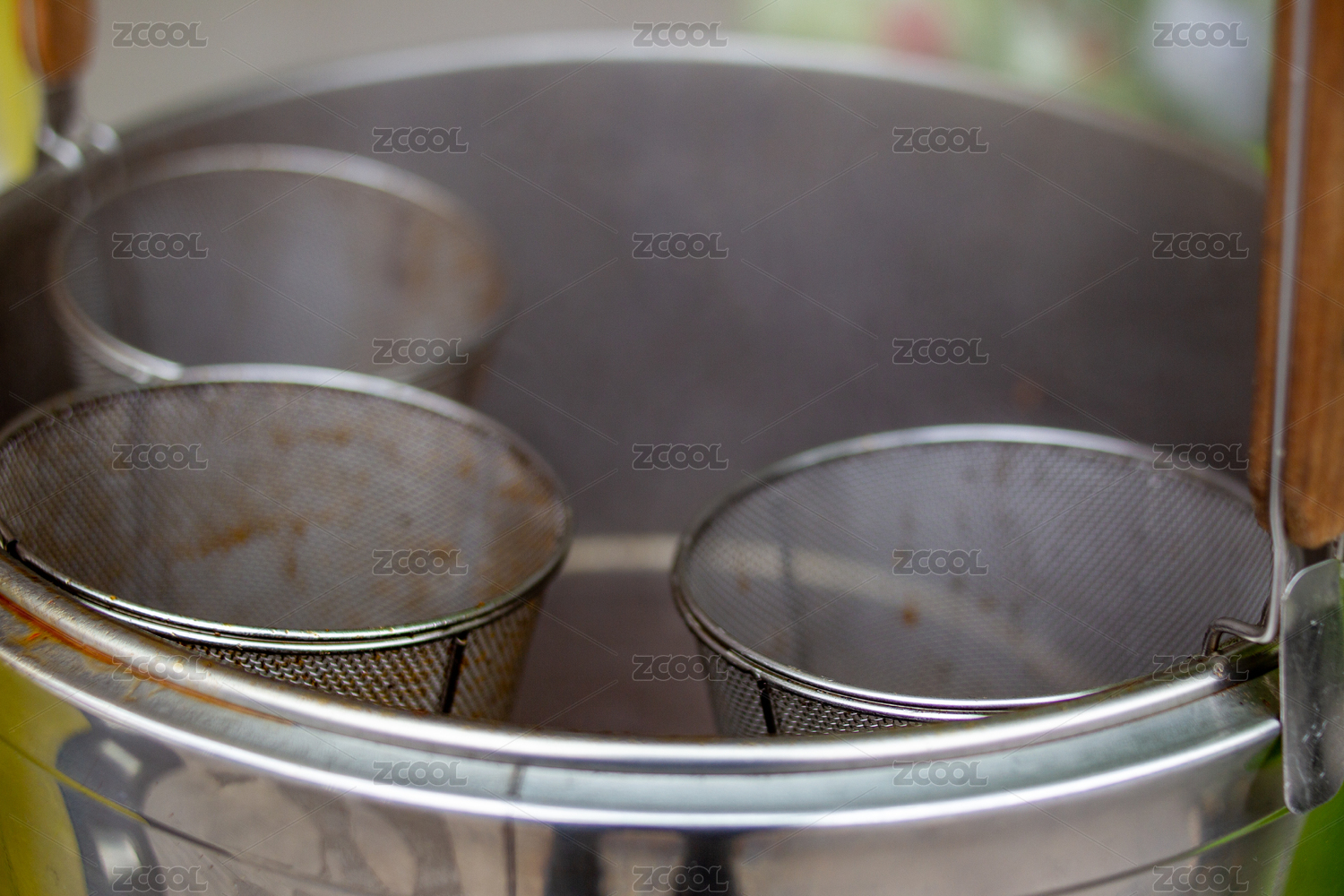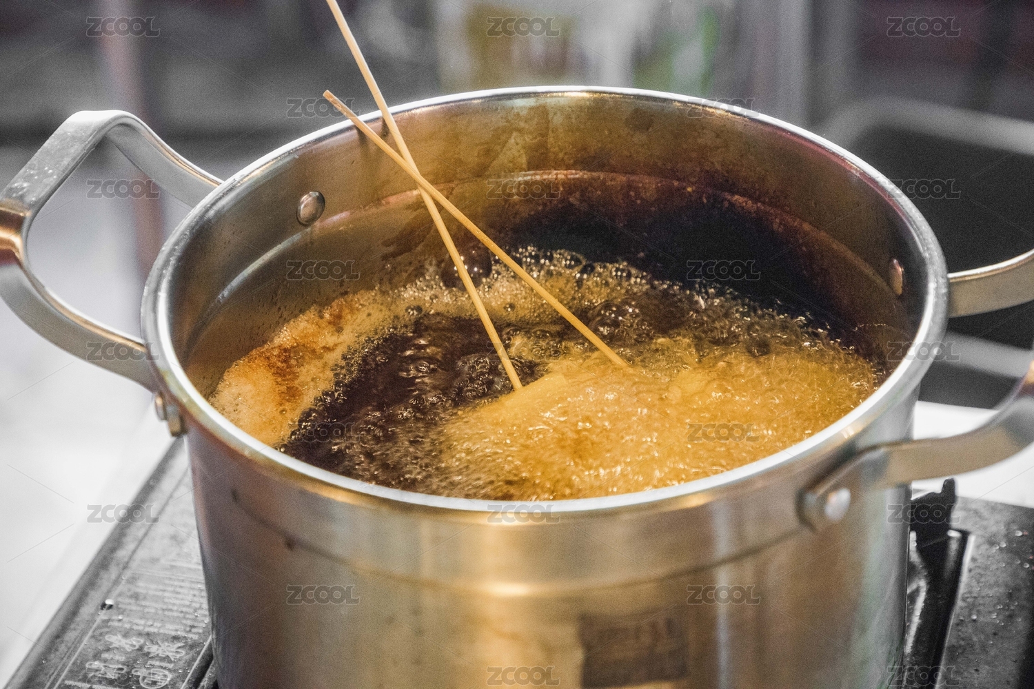 燃气灶上有一口冒着热气的油锅炸着烤串