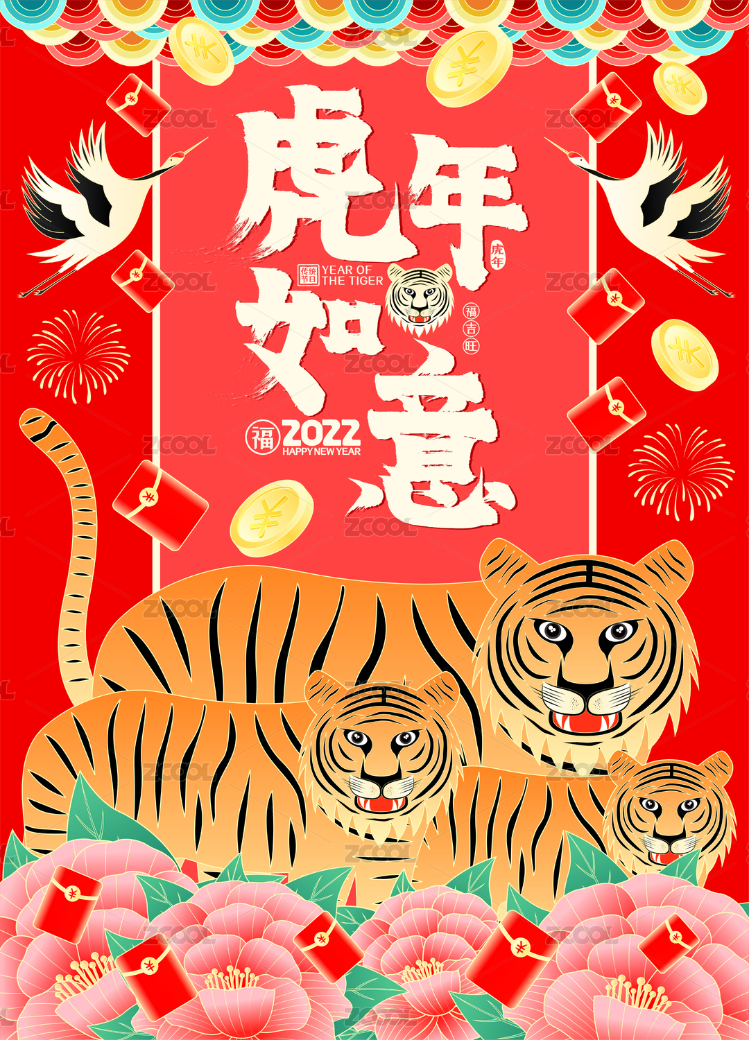 春节新年快乐老虎牡丹送福锦鲤开运国潮海报
