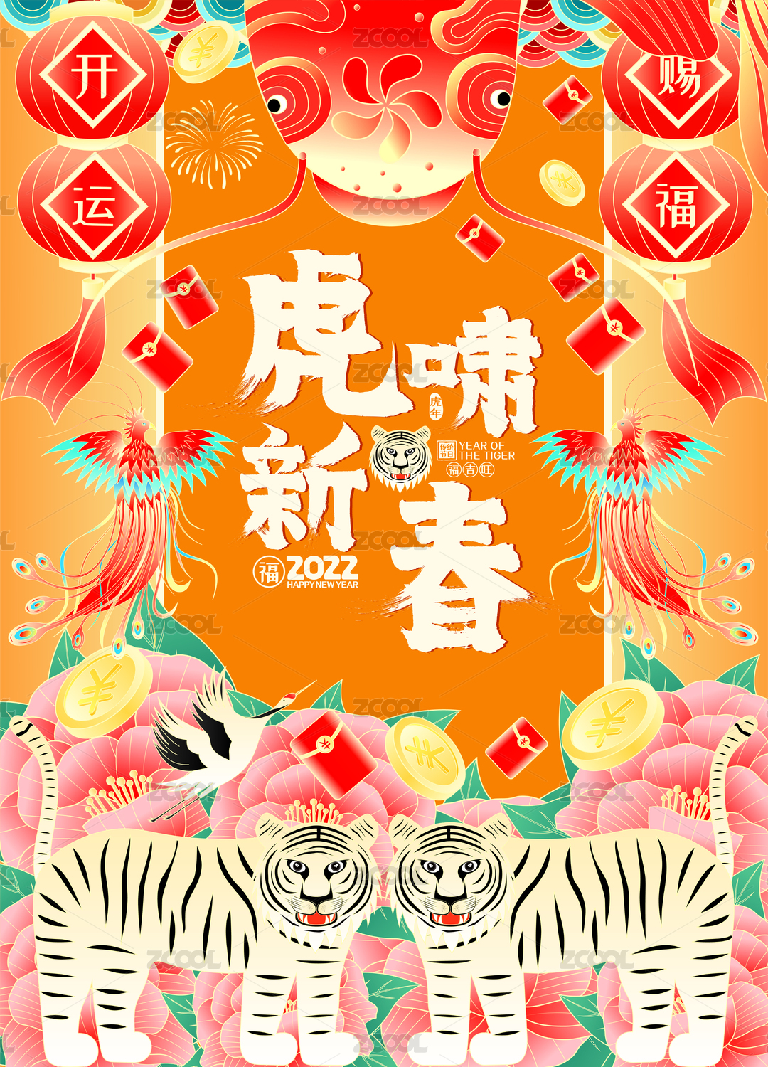 国潮春节新春福虎凤凰老虎赐福锦鲤开运海报