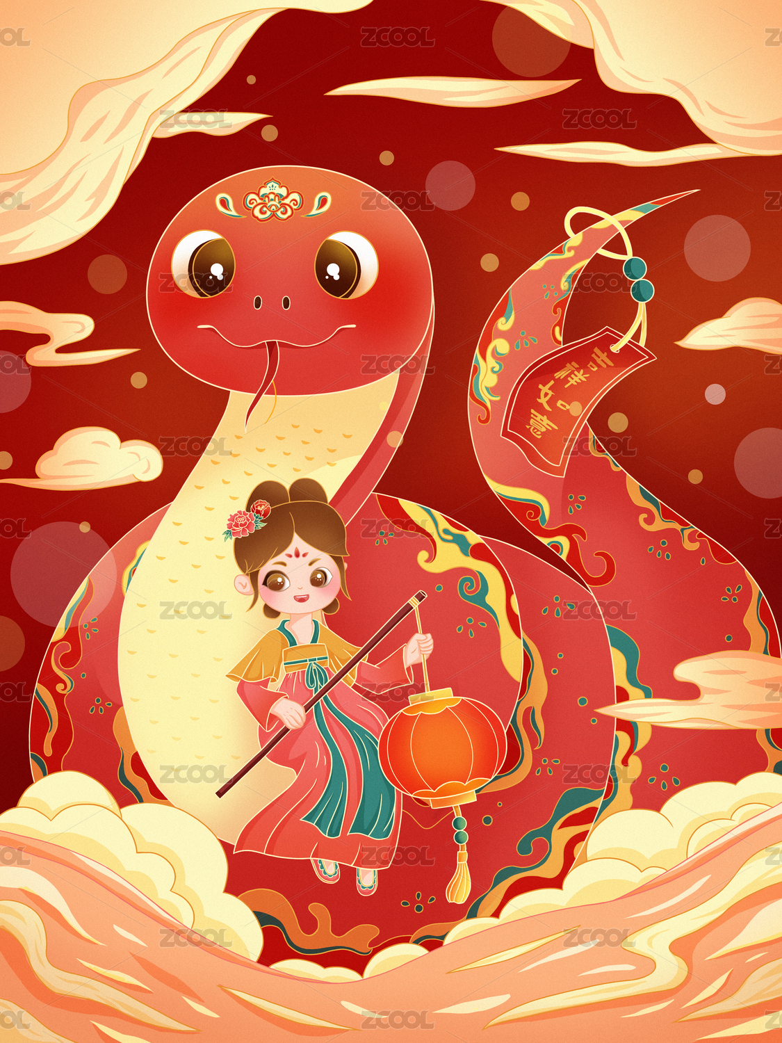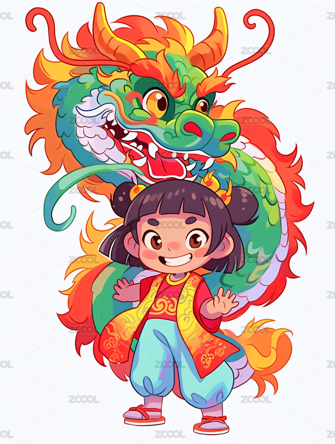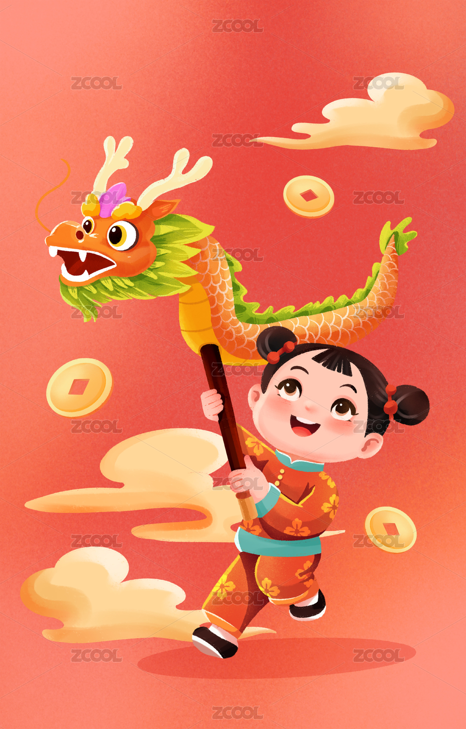 龙年喜庆插画-可爱东方龙与女孩恭贺新年