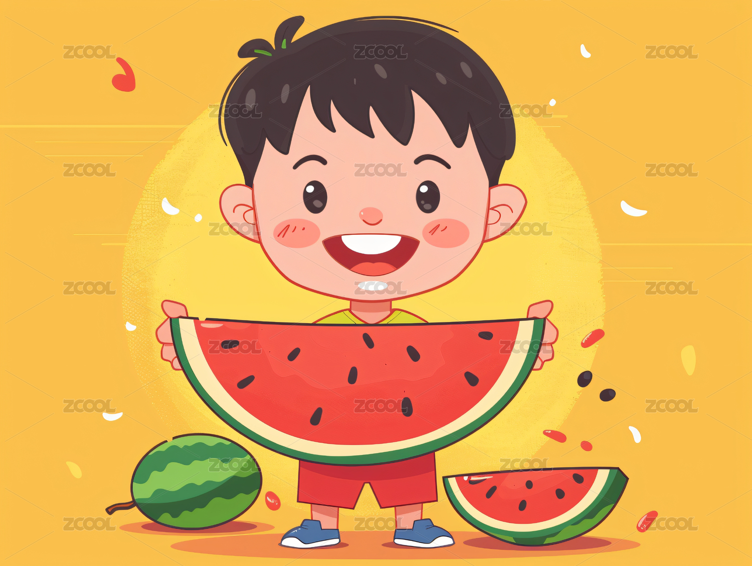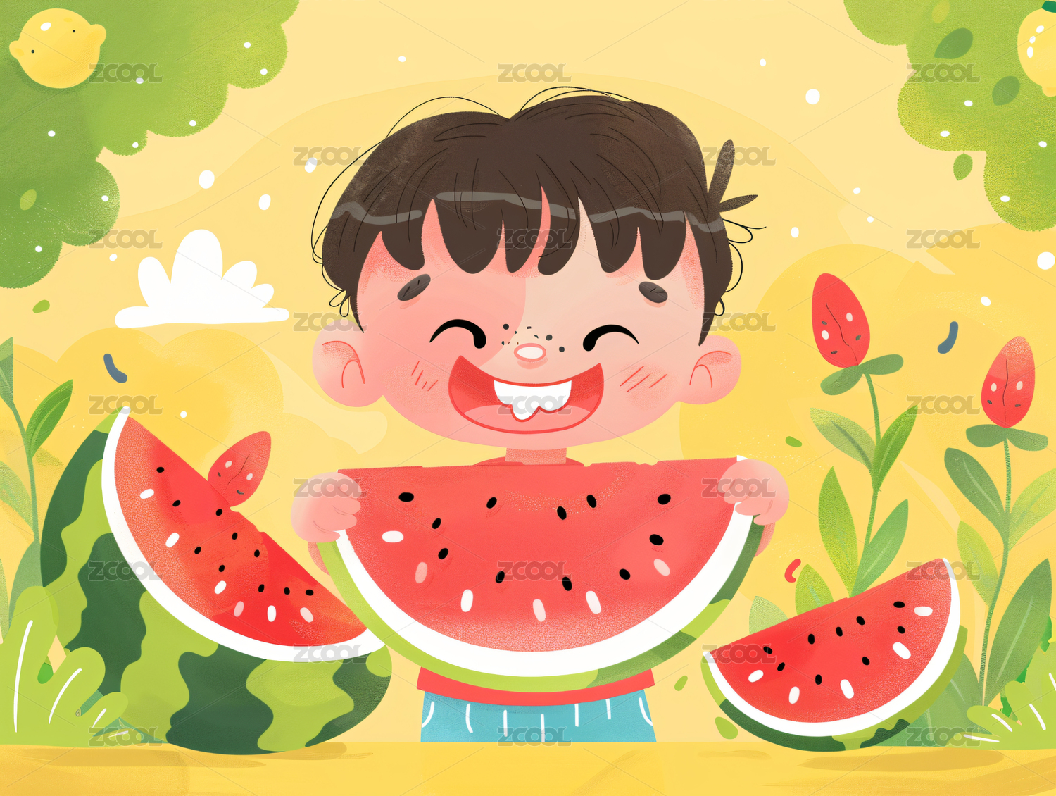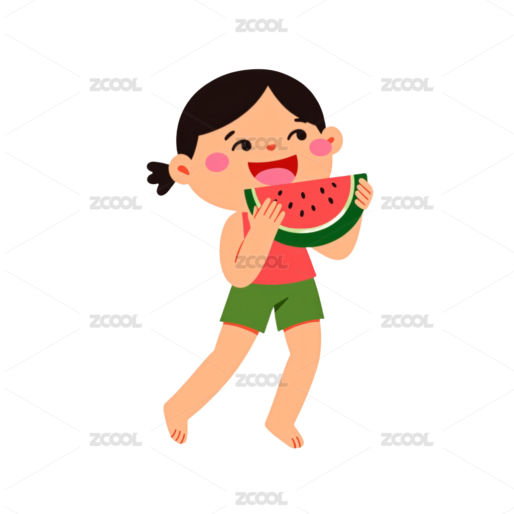卡通儿童夏天高温天气吃西瓜喝西瓜汁防中暑