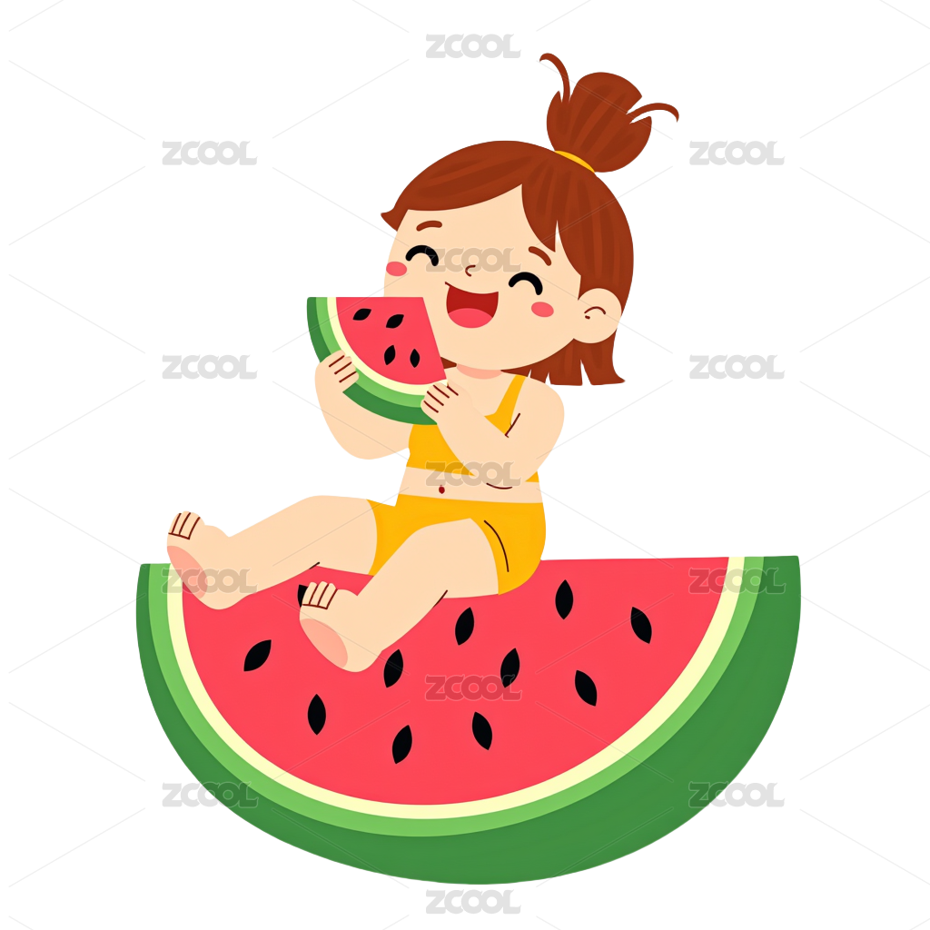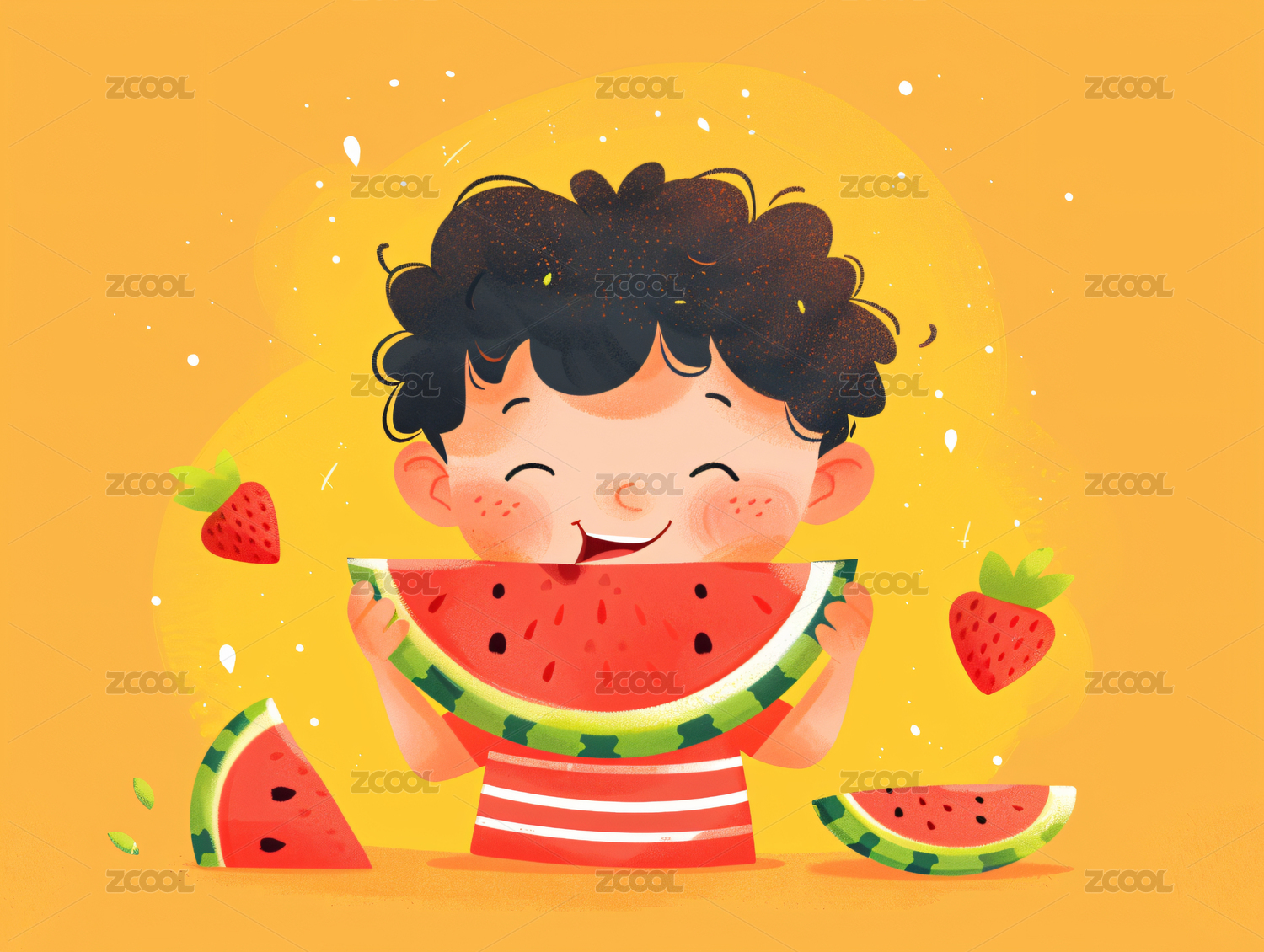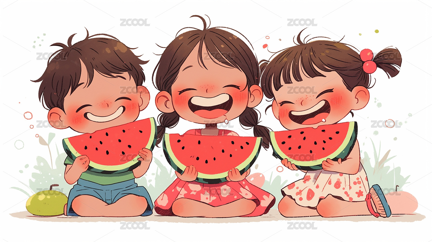 卡通儿童夏天高温天气吃西瓜喝西瓜汁防中暑