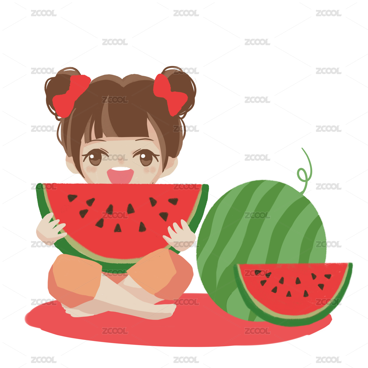 卡通双马尾穿着裙子吃西瓜的可爱女孩插画