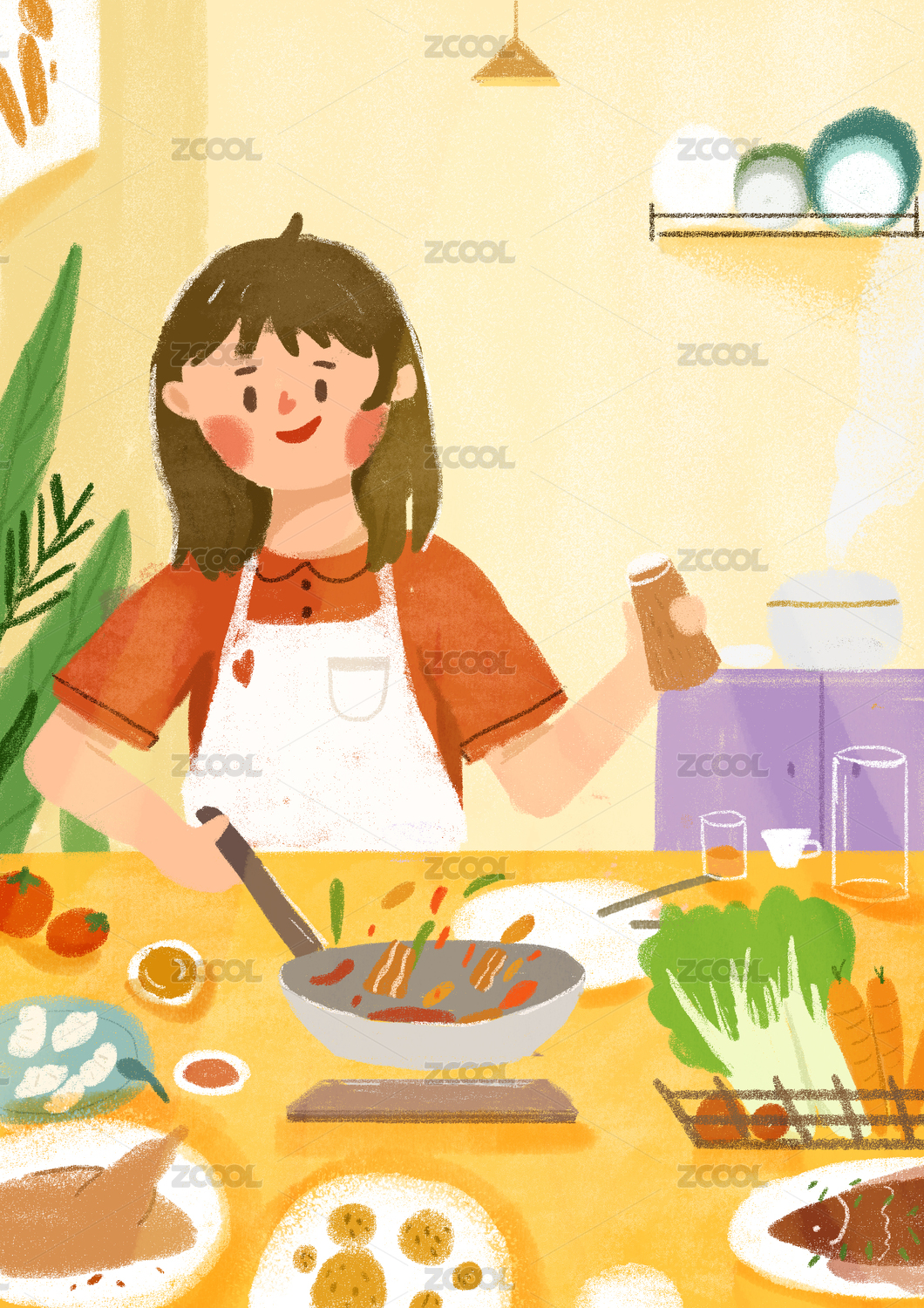 做饭的女孩插画