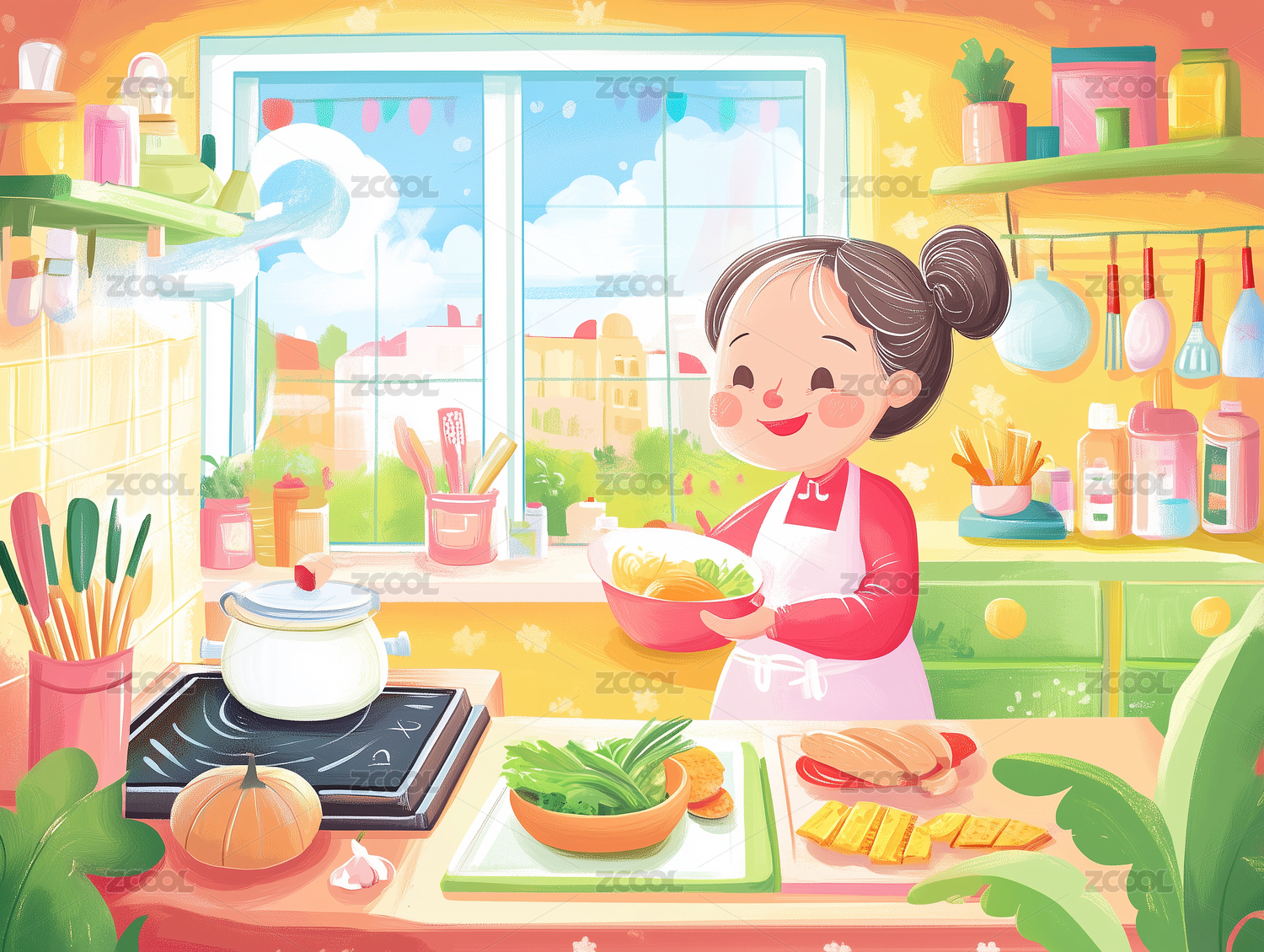 插画,做饭,厨房,扁平风,女生,下厨,植物,女,厨师,煮饭