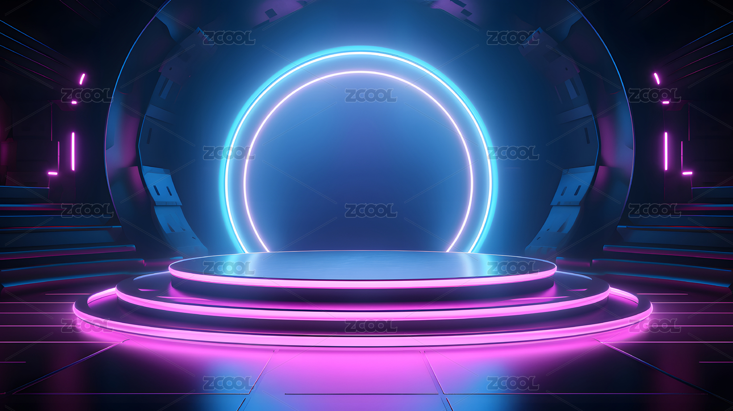 蓝色,紫色,赛博朋克,霓虹灯,灯光,展台,海报,背景