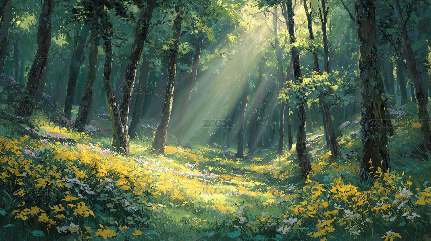 阳光照射森林插画背景海报装饰画背景