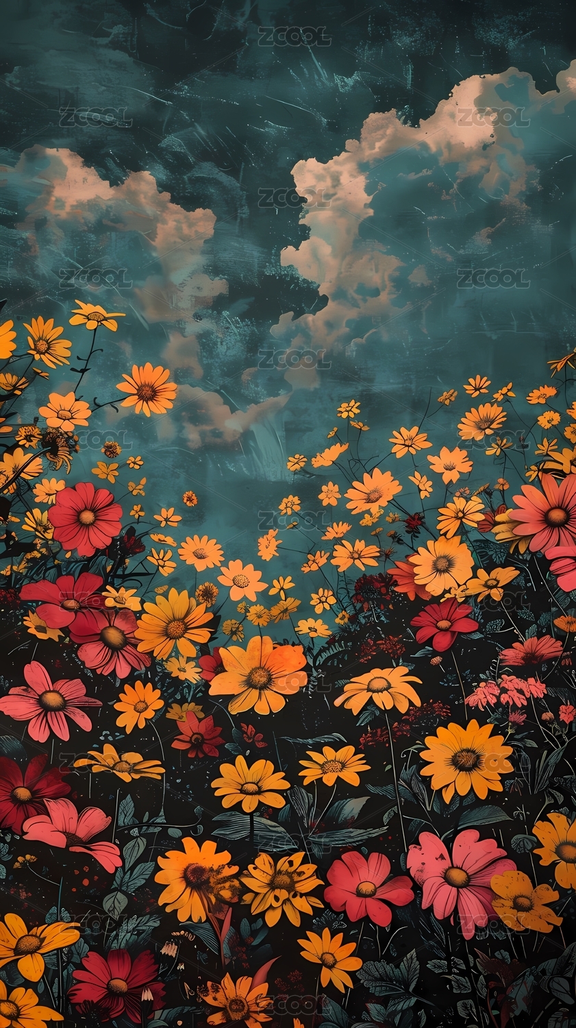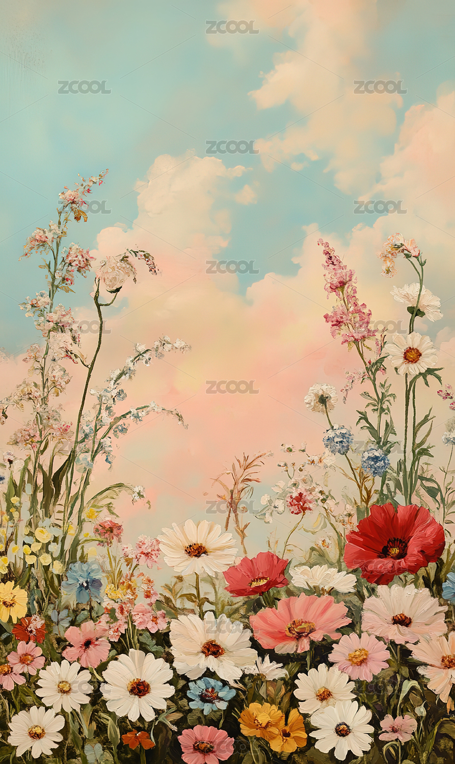 复古,云彩,蓝色,天空,花卉,植物,自然,图案,艺术,油画