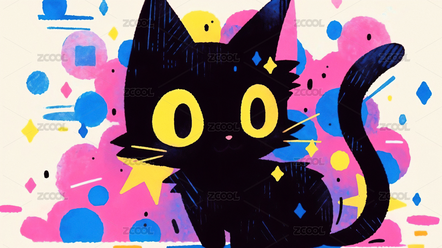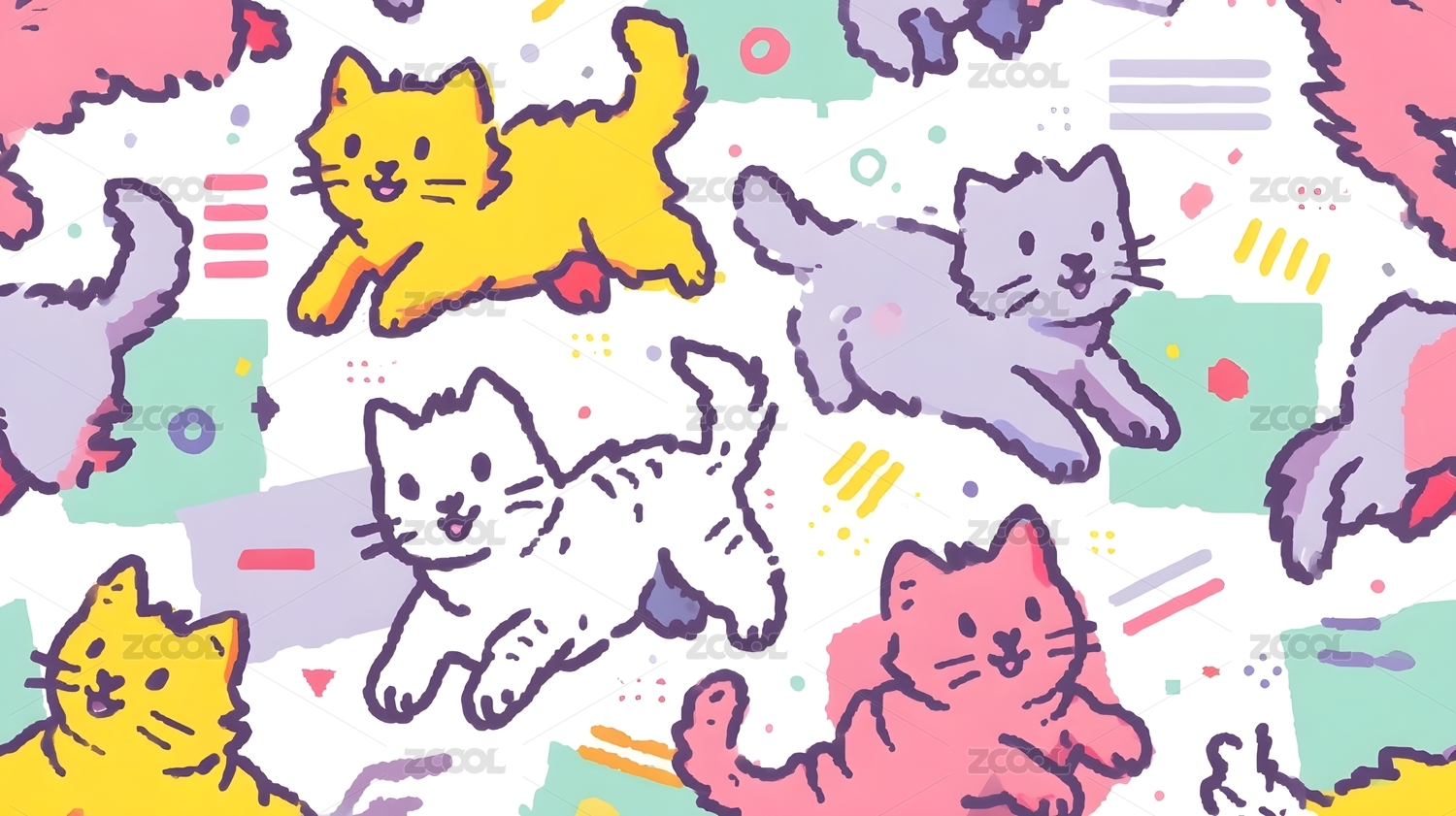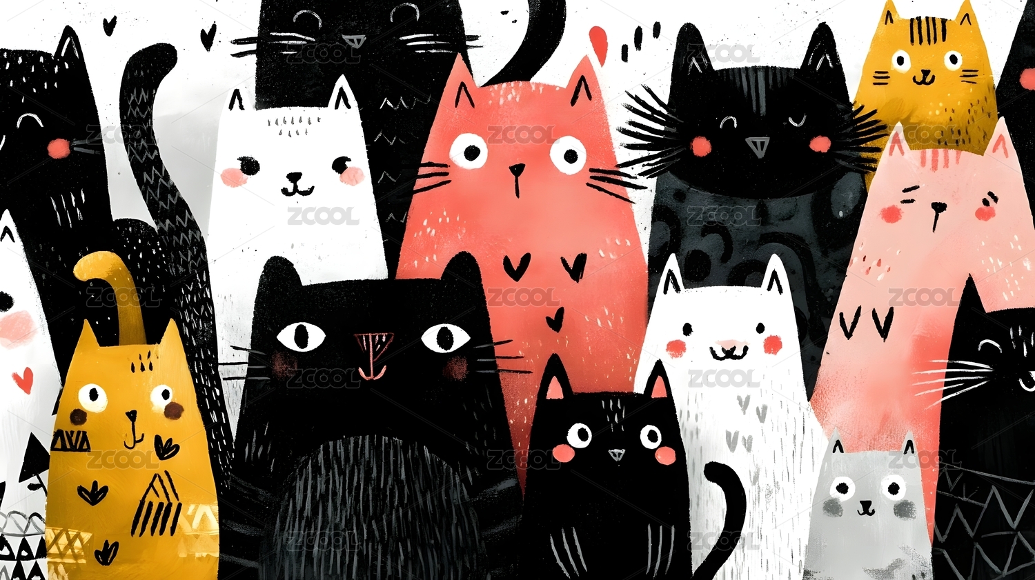 手绘彩色卡通猫猫质感笔触抽象装饰画背景