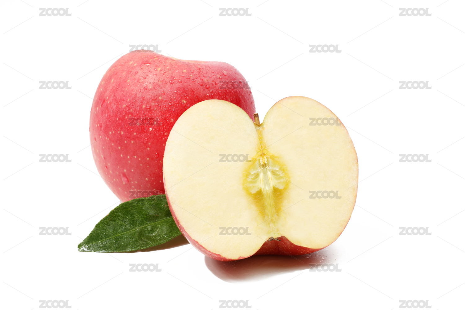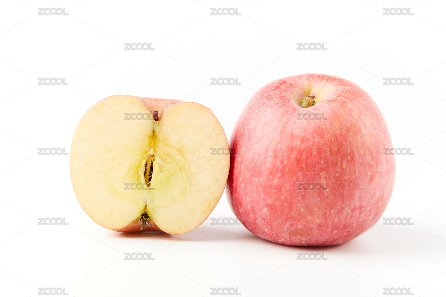 白底上放着一个完整的红富士和切面的苹果