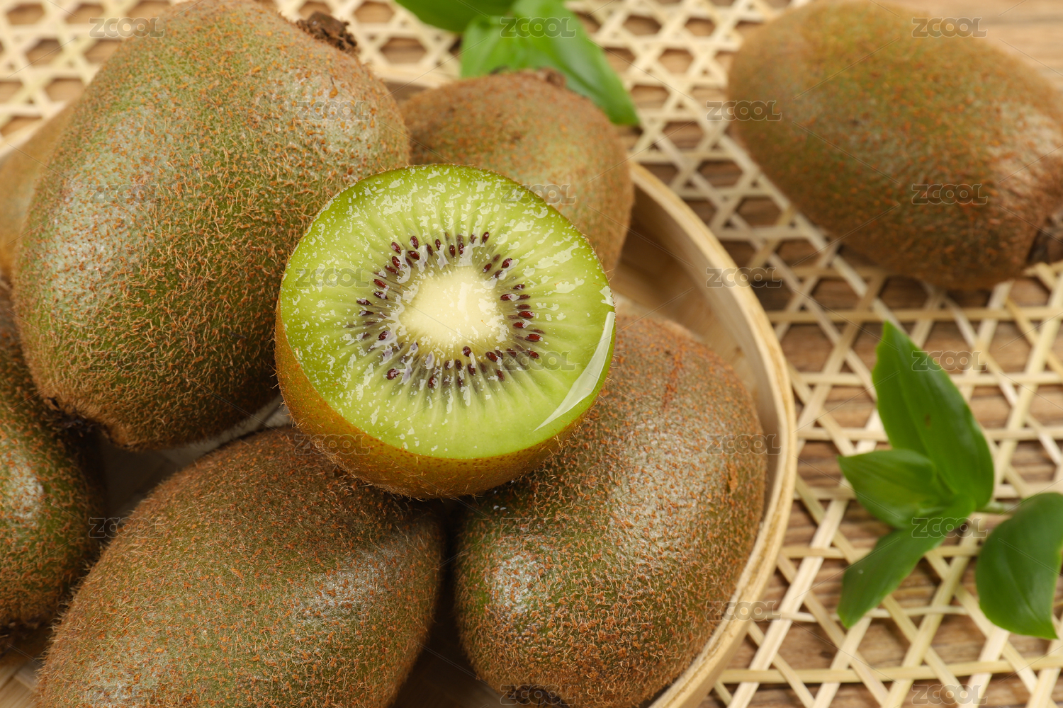 木底上放着一篮新鲜猕猴桃