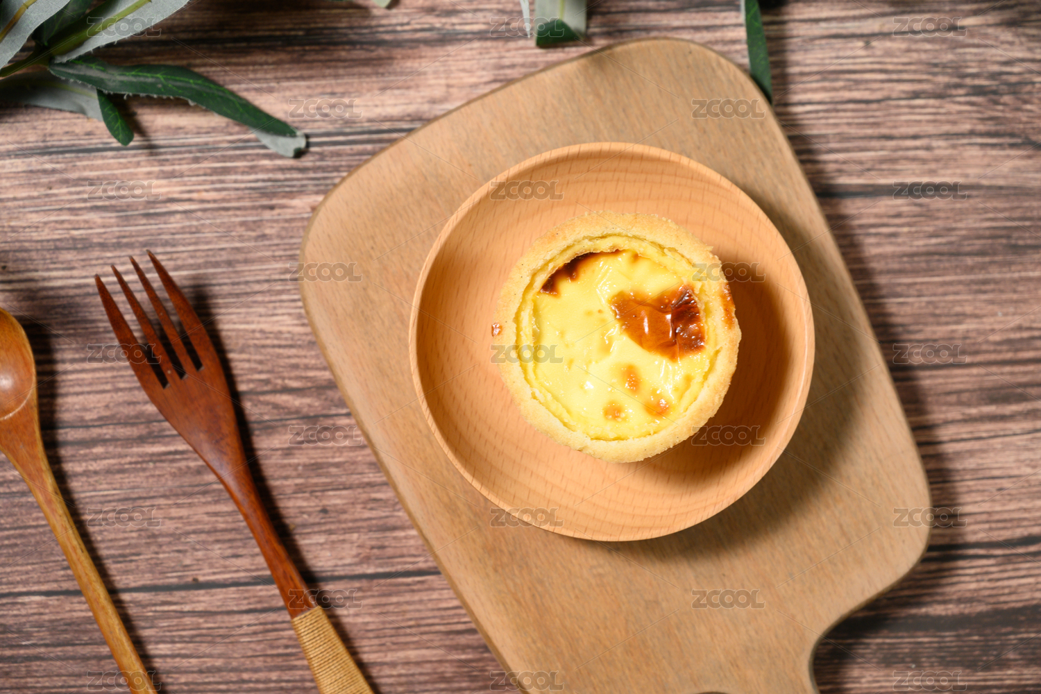 一盘美味的蛋挞放在木桌面上
