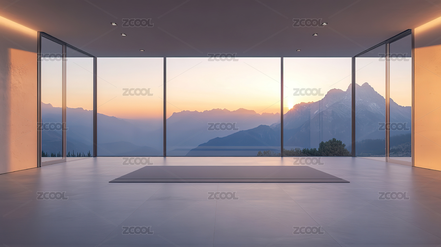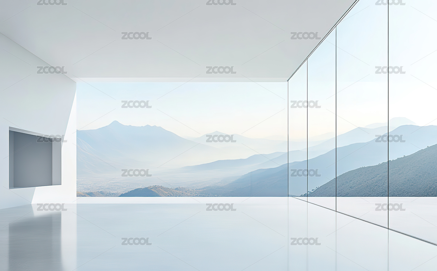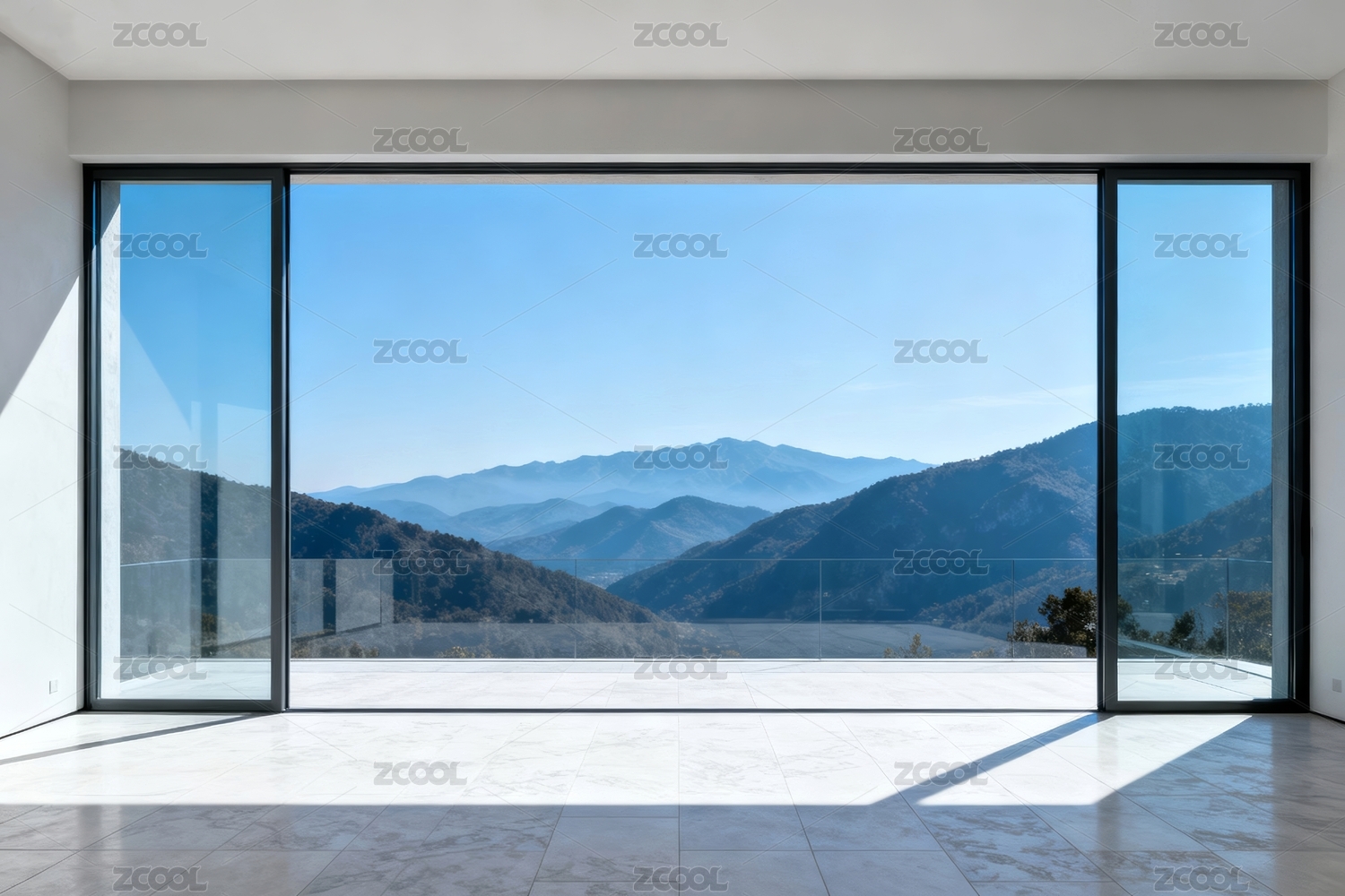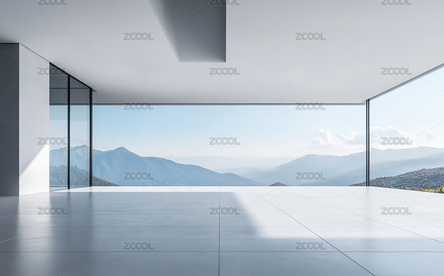 落地窗建筑内部大理石展厅带办公桌沙发窗外