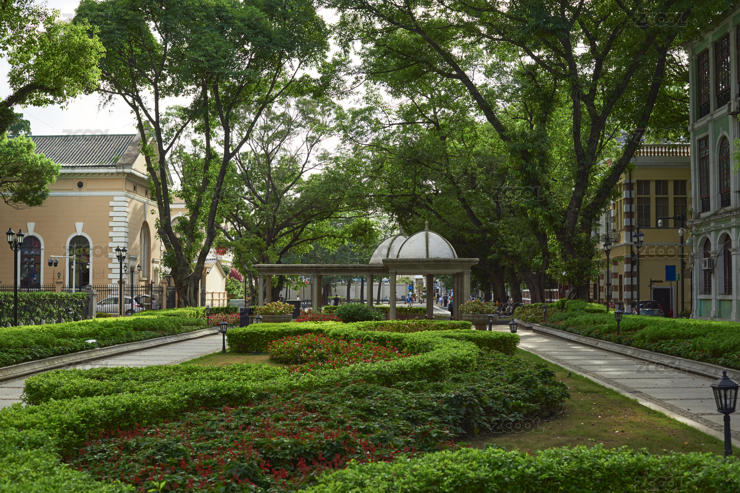 阳光照射公园绿色大草坪树木鸦片战争博物馆