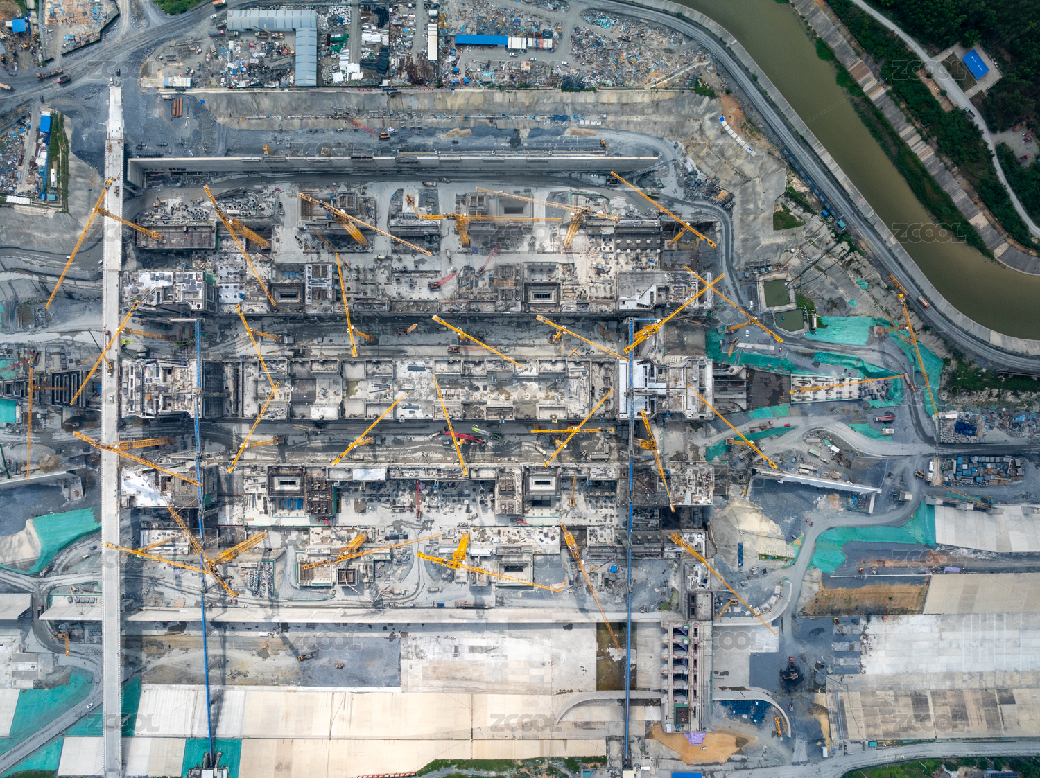 航拍中国广东广州珠江人行景观桥建设工地临时码头