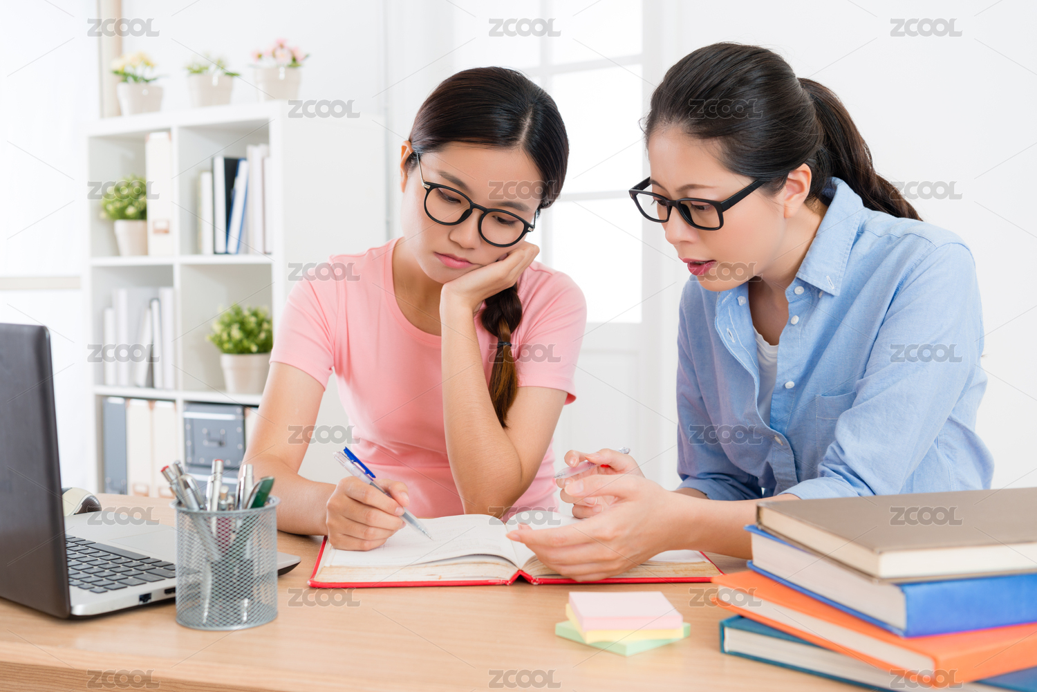 年轻漂亮的小姐个人家庭教师解释教科书的内容教给她的学生学习和准备考试。