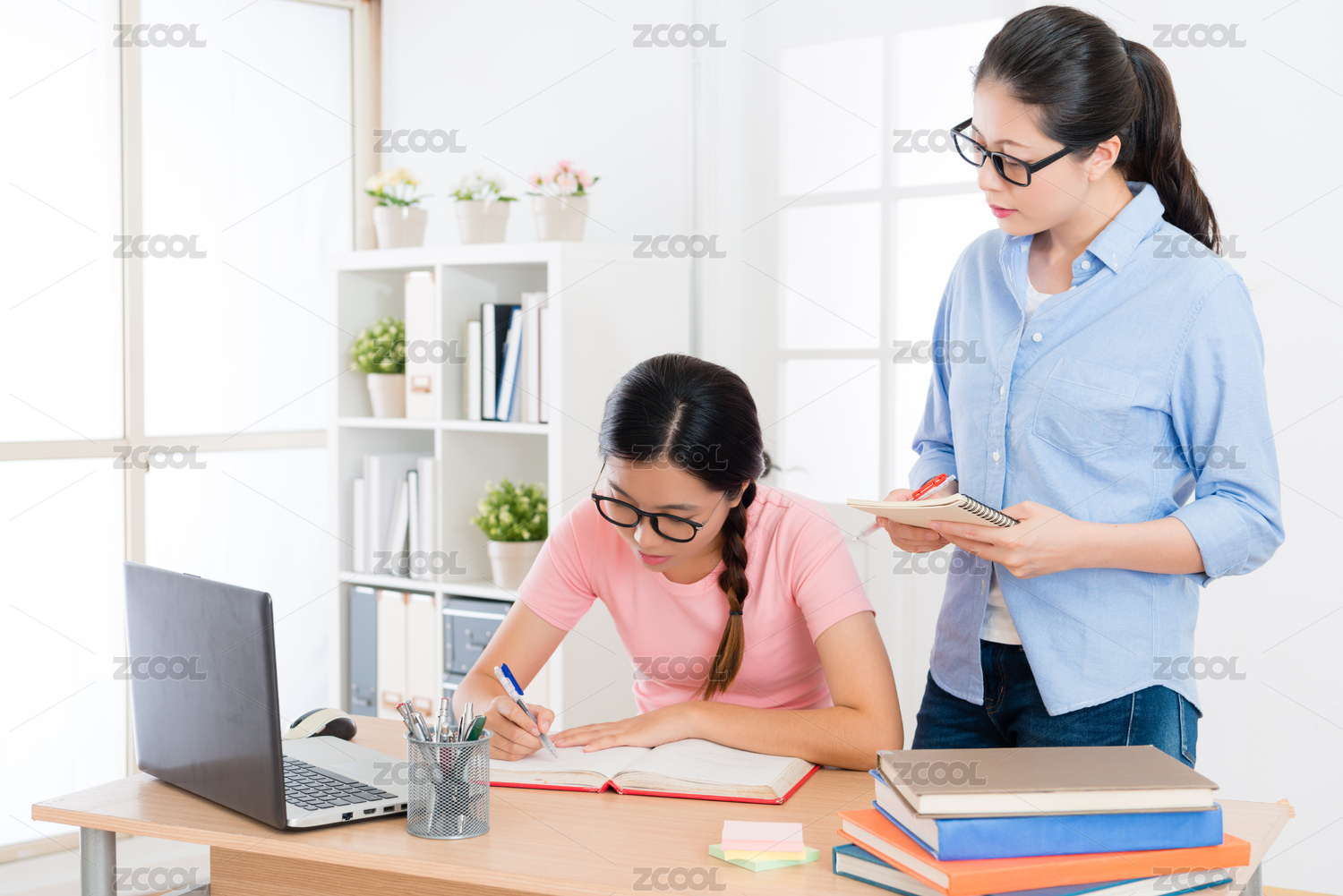 家教女人教年轻女学生做学校的工作和学习的教育类在解释问题的解决方案。