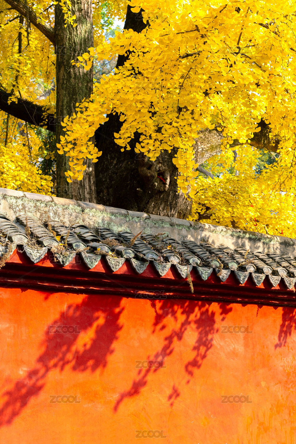秋天金黄色的千年银杏树和红色的墙