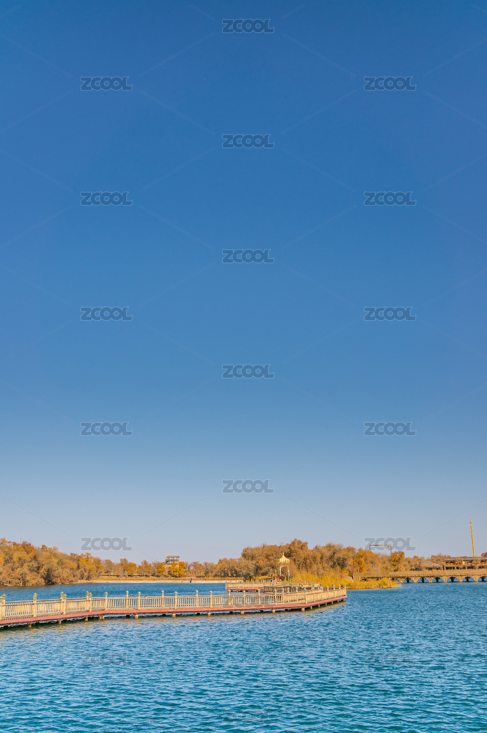 甘肃金塔县金波湖蓝天下金色胡杨林